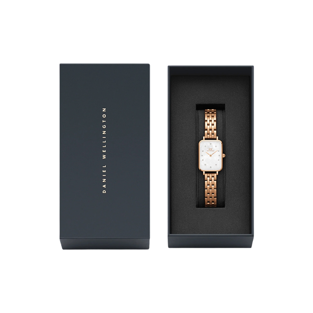 This elegant Daniel Wellington watch from the Quadro collection combines a modern geometric silhouette with luxurious textures. It features a genuine white mother-of-pearl dial that reflects a unique iridescent glow, protected by a slender 6mm thick 316L stainless steel case with rose gold PVD plating. Powered by a precision Japanese quartz movement, this Daniel Wellington watch is paired with a refined 5-link bracelet for a jewelry-like feel. With 3 ATM water resistance, this Daniel Wellington timepiece is a timeless statement piece designed for the contemporary woman.