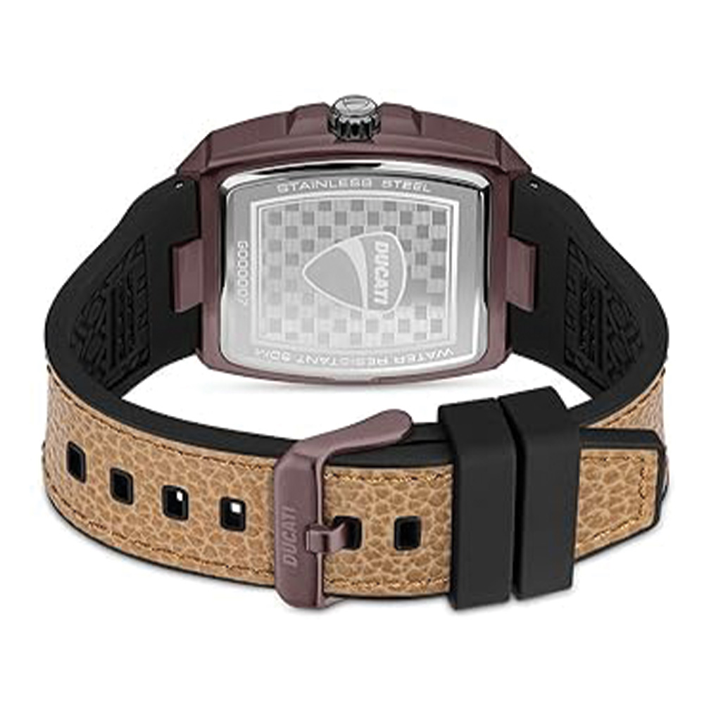 This Ducati watch features a distinctive tonneau-shaped stainless steel case paired with a black dial and a rich brown leather strap. Powered by a Swiss automatic movement, it delivers precise and reliable performance. Designed for men, it includes a secure buckle closure and water resistance, making it suitable for both everyday wear and formal occasions.