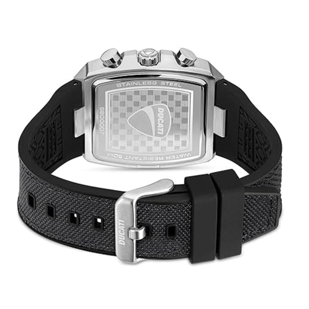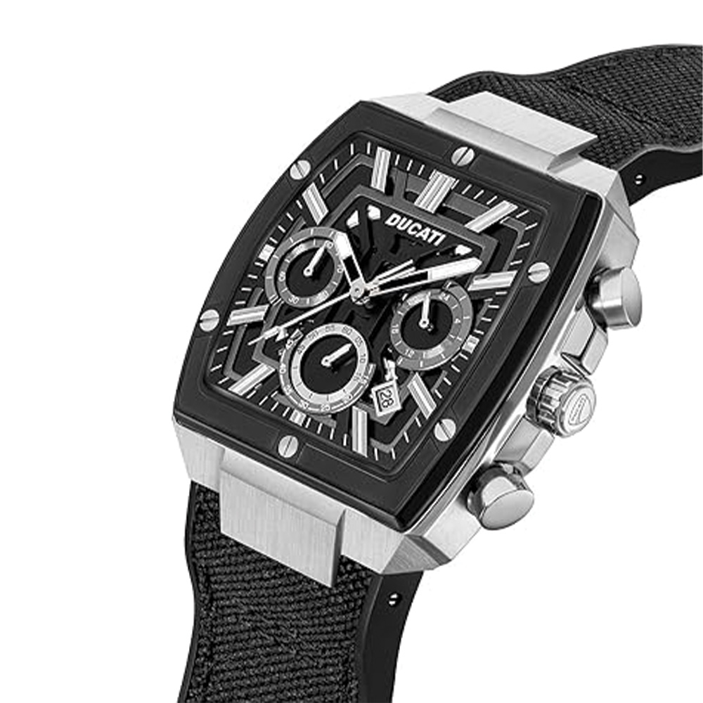 This Ducati watch features a distinctive tonneau-shaped stainless steel case paired with a sleek black dial and matching leather strap. Powered by a Swiss automatic movement, it ensures precise and reliable performance. Designed for men, it includes a secure buckle closure and water resistance, making it ideal for both everyday wear and formal occasions.