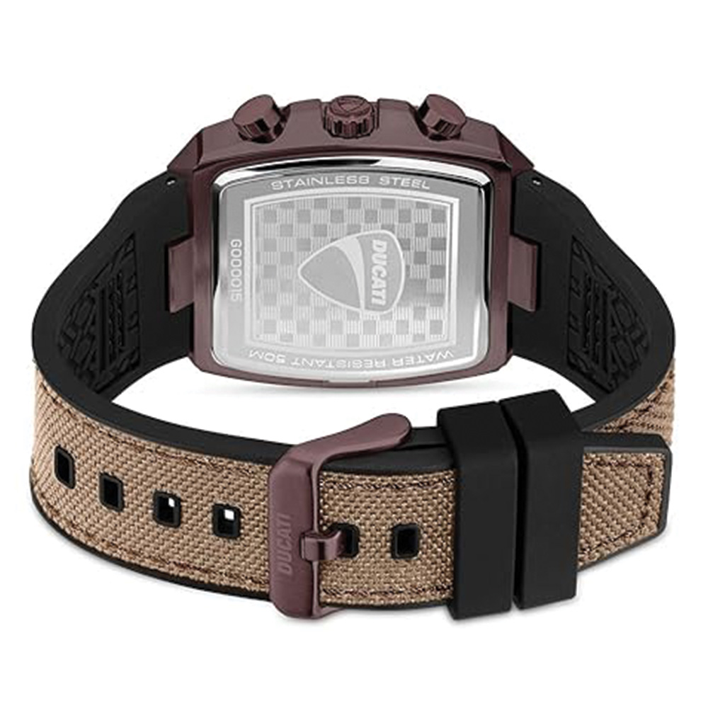 This Ducati watch features a distinctive tonneau-shaped stainless steel case paired with a rich brown dial and matching leather strap. Powered by a Swiss automatic movement, it ensures precise and reliable performance. Designed for men, it includes a secure buckle closure and water resistance, making it suitable for both everyday wear and formal occasions.