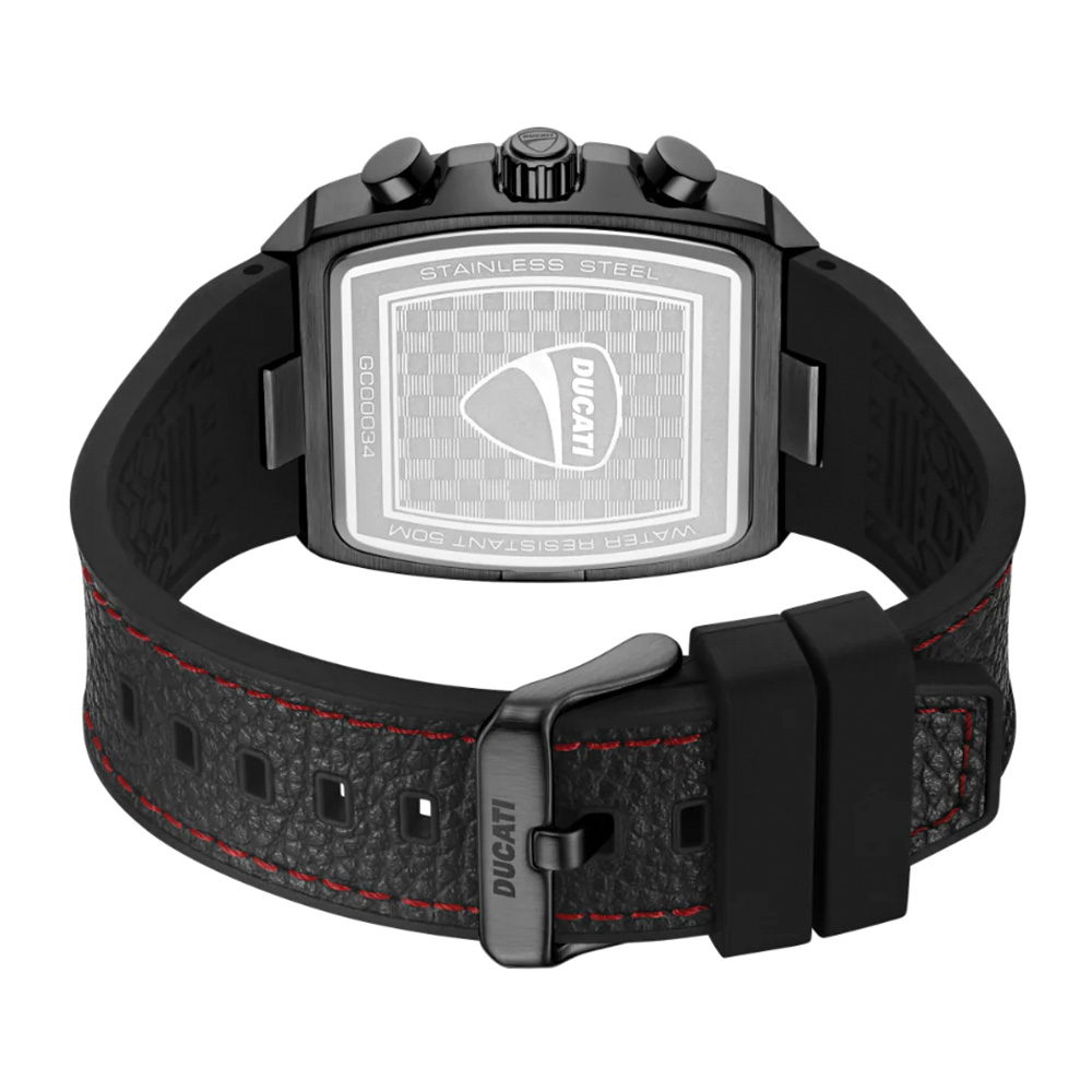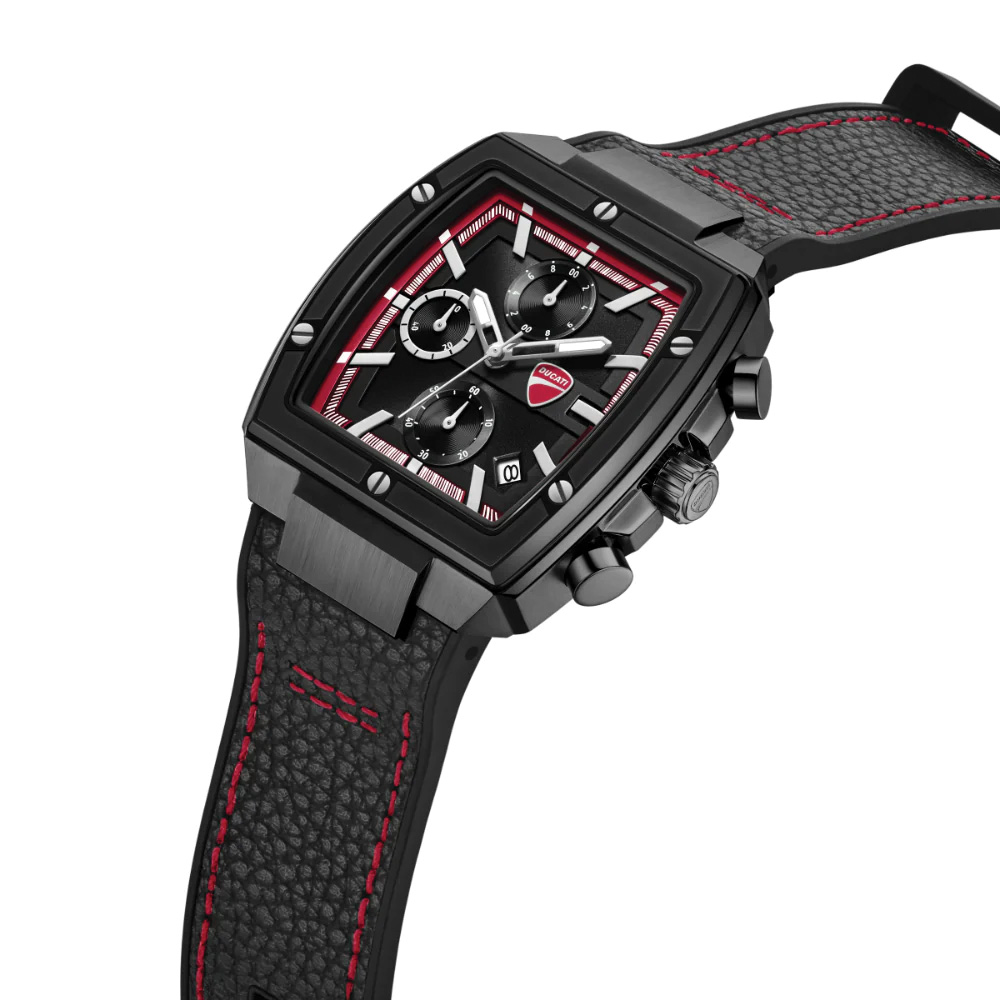 This Ducati watch features a black stainless steel case paired with a bold black dial for a sleek and modern appearance. Equipped with chronograph sub-dials and a date display, it ensures precise time tracking and everyday functionality. The high-quality silicone strap with nylon top layer provides enhanced durability, flexibility, and comfort for active lifestyles. Powered by a manual mechanical movement and protected by sapphire crystal, it delivers reliable performance with superior scratch resistance.