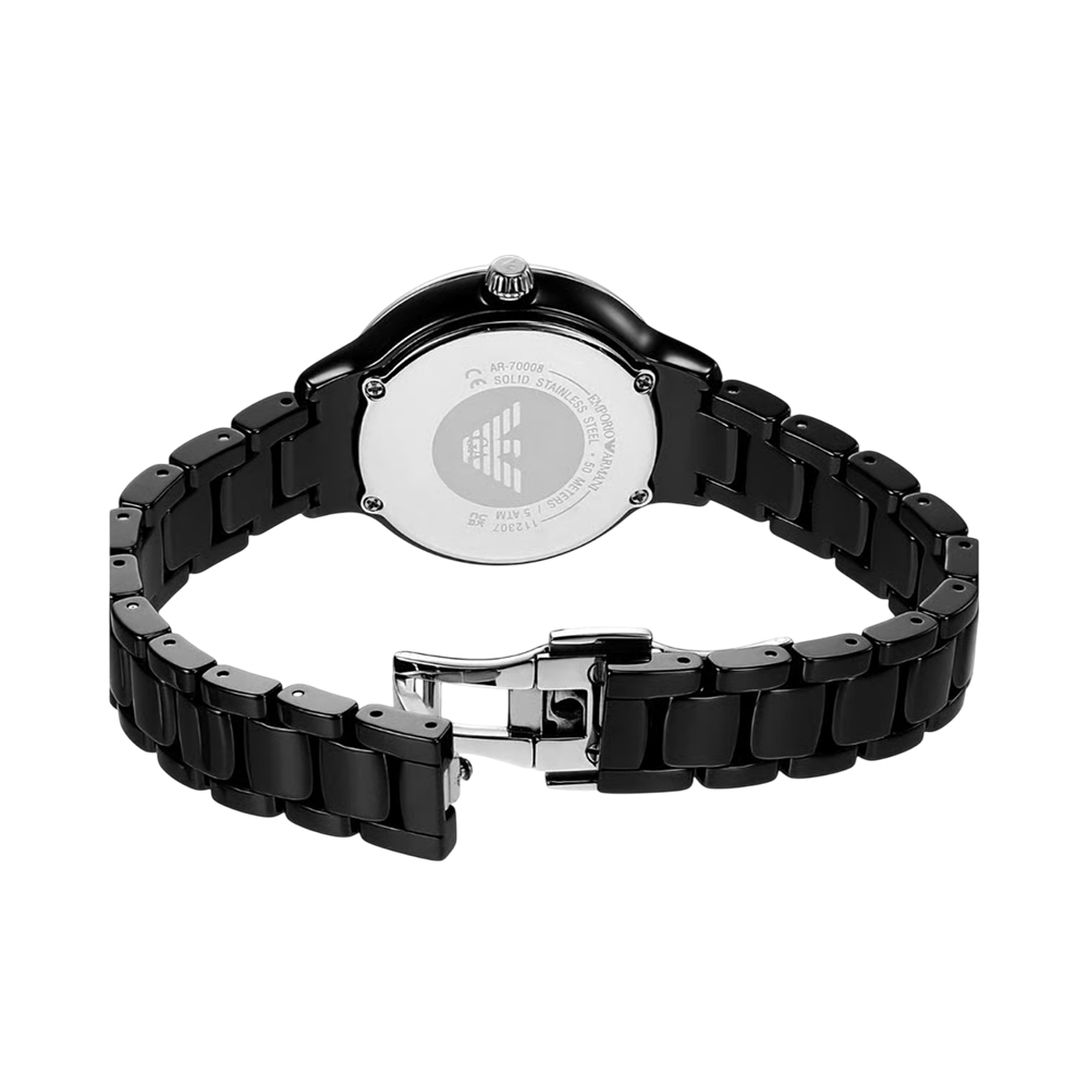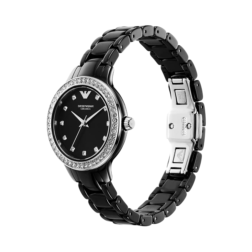 This contemporary timepiece offers a unique blend of elegance and durability. It features a minimalist black analog dial protected by durable mineral glass and powered by a reliable quartz movement with hour, minute, and second functionality. The lightweight and smooth black ceramic strap provides a sophisticated all-black aesthetic, secured comfortably with a deployment clasp. This watch is designed for the modern woman seeking a luxurious yet practical accessory for both daily wear and special occasions.