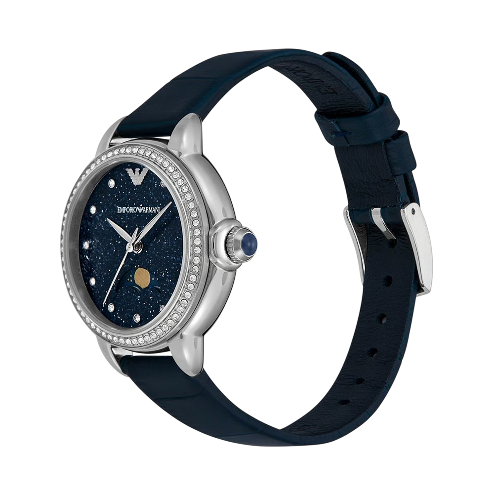 This sophisticated timepiece from EMPORIO ARMANI is designed to amaze with its refined details and enchanting aesthetic. It features a rich blue dial that mimics a starry sky, protected by durable mineral glass and powered by a reliable three-hand moon phase quartz movement. The genuine blue crocodile-embossed leather strap provides a comfortable fit and adds a touch of luxurious texture, secured with a classic buckle clasp. With 50m water resistance, this watch is ideal for adding a statement of elegance to any ensemble.