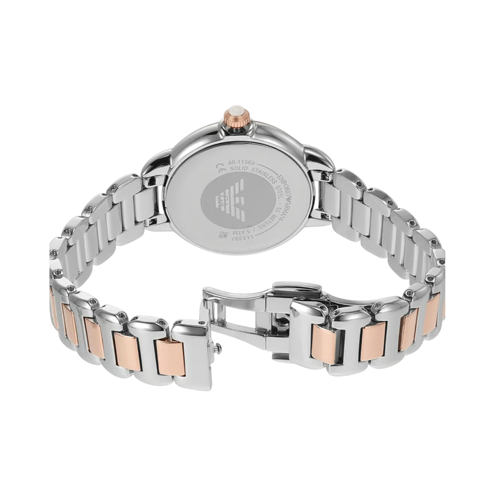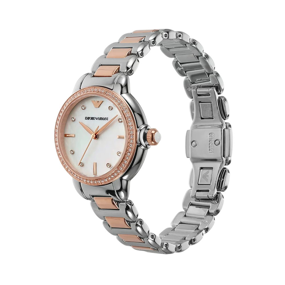 This elegant timepiece offers a perfect blend of luxury and precision. It features a luminous white Mother of Pearl (MOP) dial protected by durable mineral glass and powered by a reliable quartz movement with hour, minute, and second functionality. The stainless steel strap in a silver and gold-tone bicolor finish adds a modern touch, while the deployment clasp ensures a secure and comfortable fit. With 50m water resistance, this watch is a timeless accessory designed for the sophisticated woman.