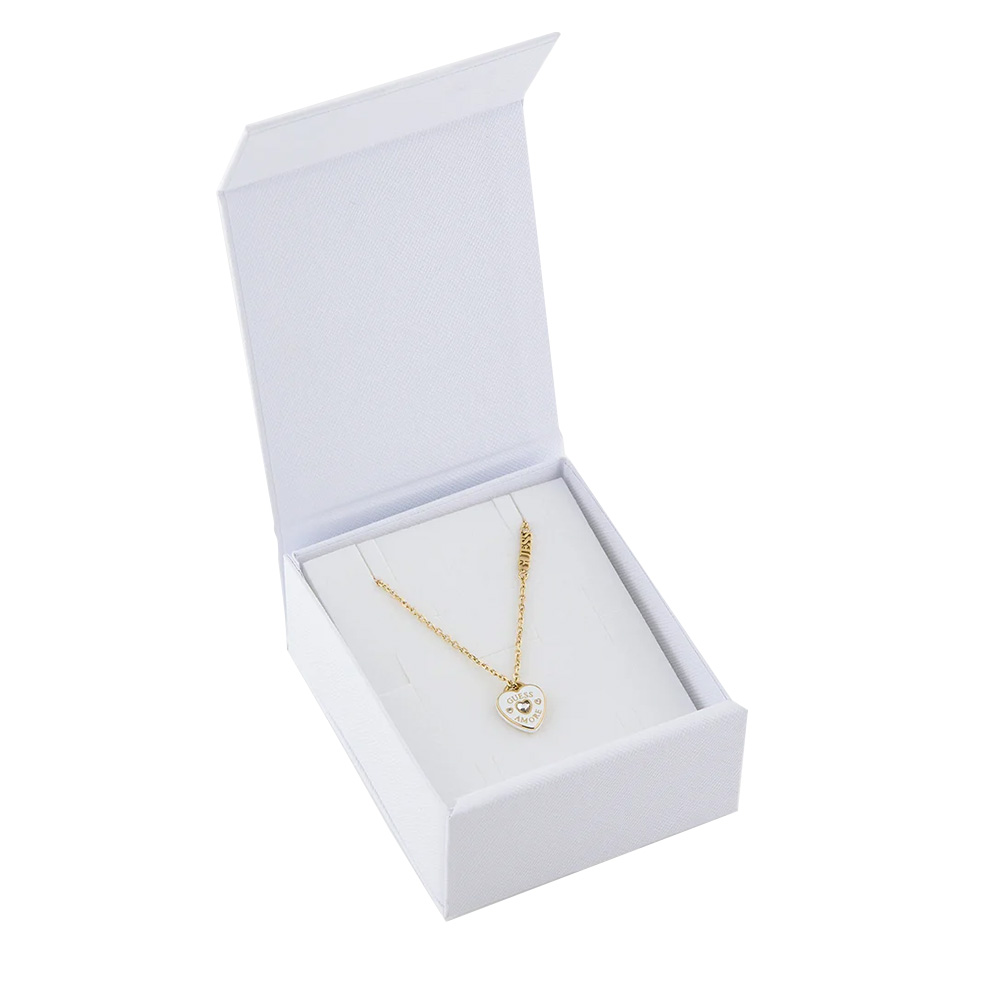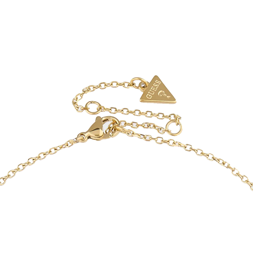 This Guess Amore necklace features a polished gold-tone stainless steel chain adorned with a white heart-shaped charm embellished with sparkling crystals. Designed for women, it includes an adjustable clasp for a comfortable fit, perfect for both everyday wear and special occasions.