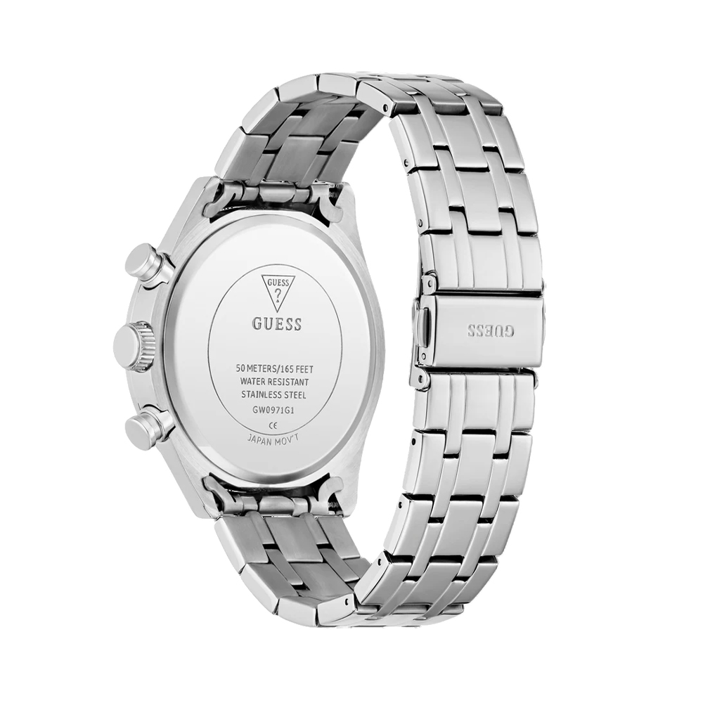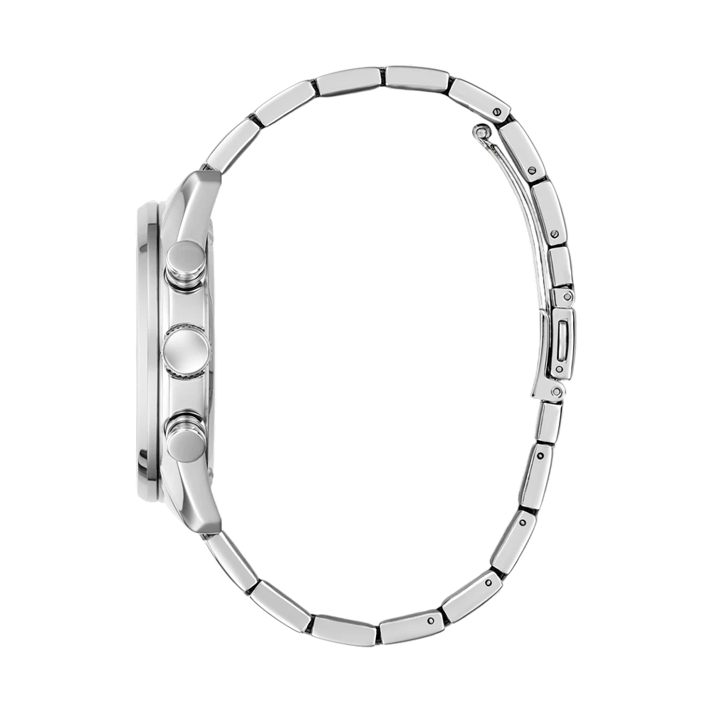 Command attention with this modern dress timepiece that combines sophisticated functionality with timeless elegance. Featuring a 44 mm round silver tone polished recycled steel case and paired with a silver tone polished five-link stainless steel bracelet. The black sunray dial and pusher accents on the case offer a chrono-look multi-function capability. With 50 meters water resistance, this distinguished timepiece is perfect for the man who demands both functionality and refined elegance in his dress watch.