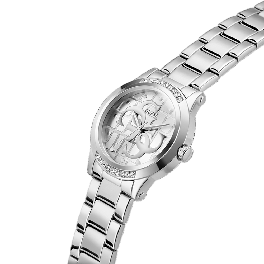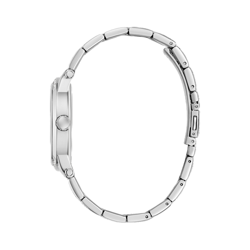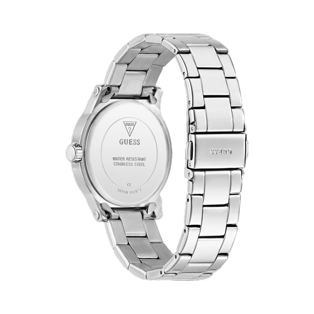 A chic and sophisticated women's analog watch from the GUESS Annette collection, designed to add a touch of elegance to any outfit. This timepiece features a classic round dial and is housed within a durable recycled steel case, showcasing a modern and eco-conscious design. It is paired with a matching recycled steel bracelet and is powered by a precise quartz movement, offering a reliable and fashionable accessory for daily wear. With its water resistance up to 30 meters and push-button clasp, it offers both style and practicality.