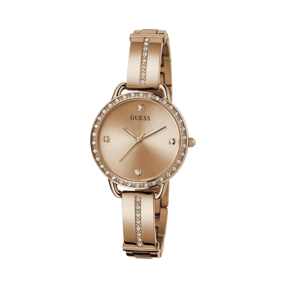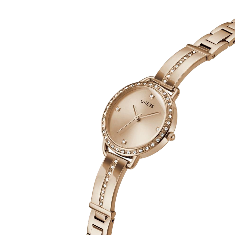 The GUESS Bellini Watch GW0022L3 is a luxurious GUESS timepiece that exemplifies modern American glamour. Meticulously crafted from high-grade stainless steel with a radiant rose gold-tone finish, this GUESS watch features a 30 mm round case and a matching analog dial that radiates timeless elegance. Powered by a precision quartz movement and protected by durable mineral glass, it is designed for both style and longevity. With 3 ATM water resistance and a sleek bracelet strap, this GUESS watch effortlessly elevates any ensemble, making it an essential statement piece for the contemporary woman.
