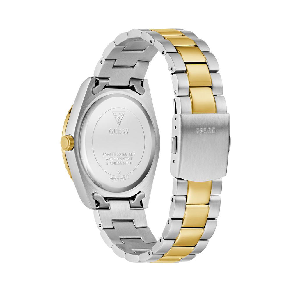 Upgrade your accessory collection with this stylish men's analog watch from the GUESS Carryover Connoisseur collection. It features a classic round dial within a stainless steel case, and a durable bracelet-style strap. Powered by a precise quartz movement, this watch also boasts a day/date function, adding a layer of practicality to its sophisticated design. With a 50-meter water resistance, it is a perfect blend of style and durability for the modern man.