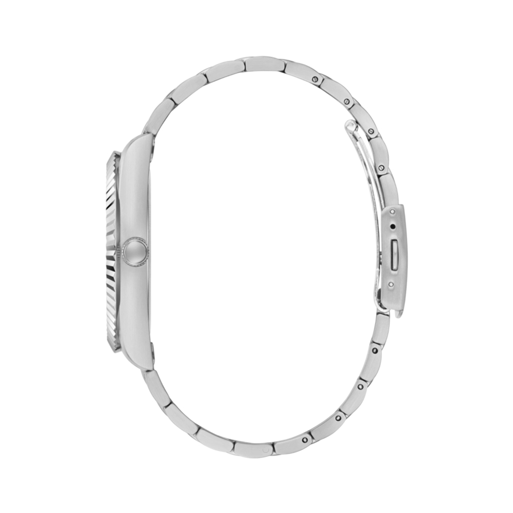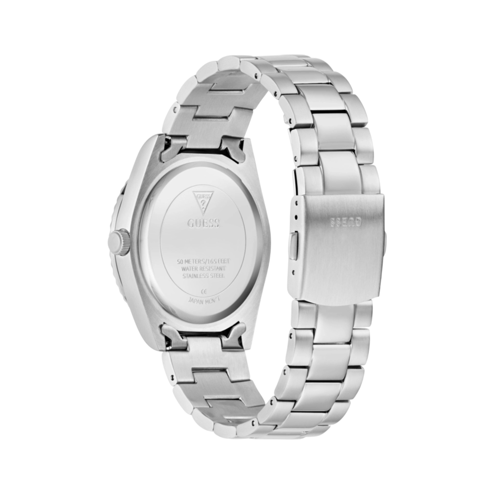 Experience classic style with the Guess Connoisseur Analog watch (GW0736G1) for men. This everyday watch features a 42mm round case and bracelet made from recycled stainless steel in a polished silver-tone finish. The deep blue, three-hand dial with its elegant design is protected by mineral glass. Powered by a reliable quartz movement and water-resistant up to 50 meters, this timepiece is a dependable and sophisticated accessory for the modern man.