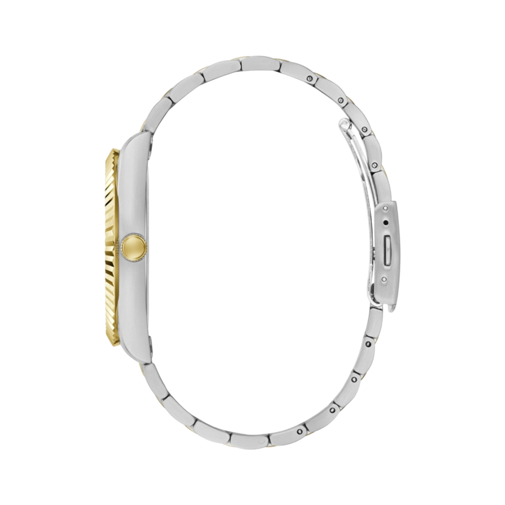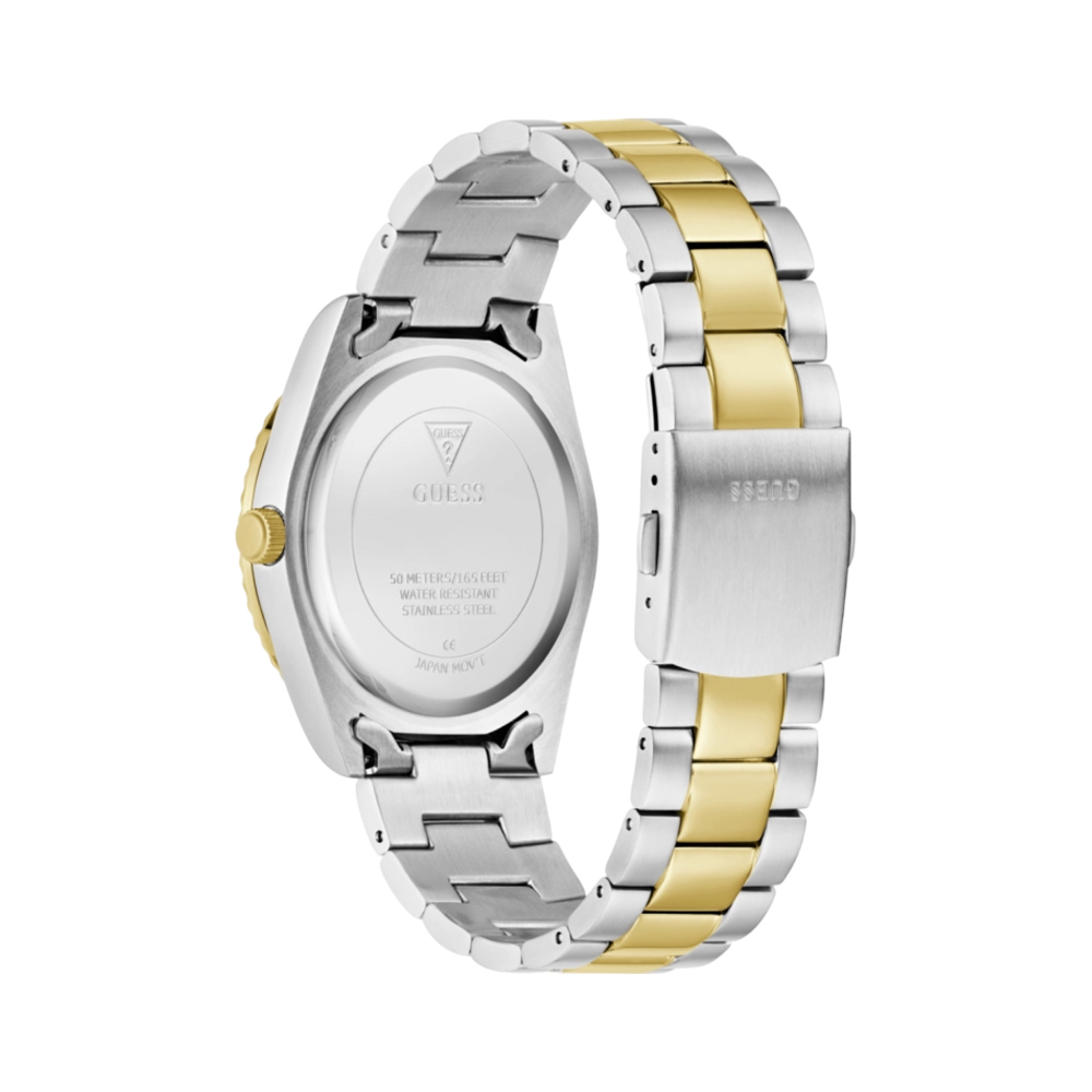 The Guess Connoisseur Analog watch (GW0736G2) for men is a great everyday watch with a classic yet modern look. It features a 42mm round case made of recycled stainless steel in a two-tone silver and gold finish. The easy-to-read, green three-hand dial is protected by mineral glass, while the two-toned stainless steel bracelet adds a sophisticated touch. With a water resistance of 50 meters, this quartz-powered watch is a dependable choice for any man seeking a blend of classic and modern style.