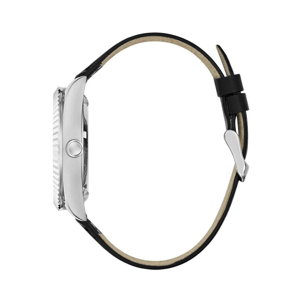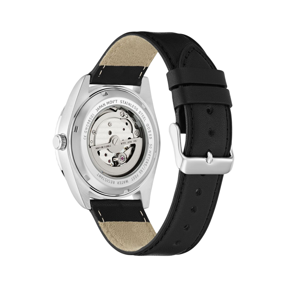 This timepiece features a rugged silver stainless steel case with a unique coin-edge bezel and a semi-skeleton black dial, offering a captivating glimpse into the mechanical movement. Its reliable automatic movement is both practical and a celebration of classic watchmaking. The watch is completed with a durable black leather strap and a pilot buckle closure, ensuring a comfortable and secure fit. With its timeless look and 50-meter water resistance, this watch is a dependable choice for any man seeking a blend of classic and modern style.