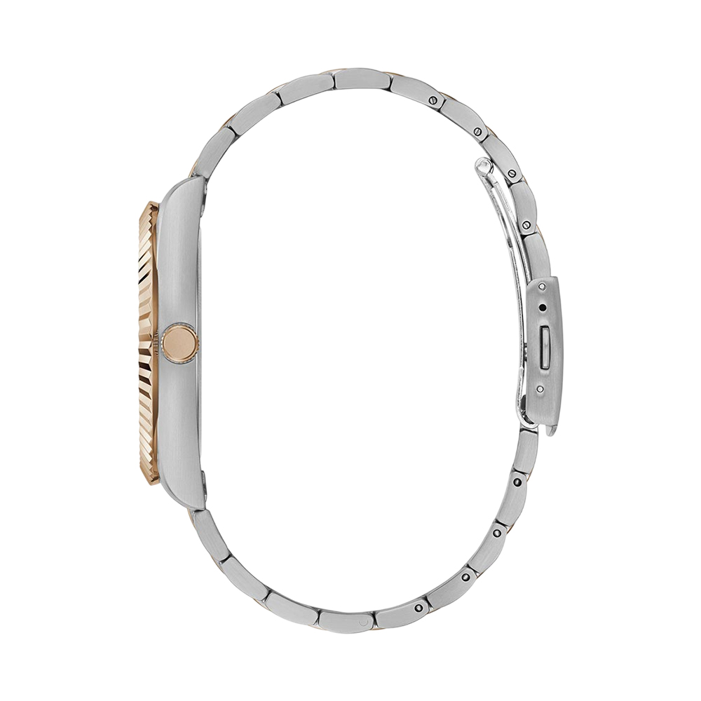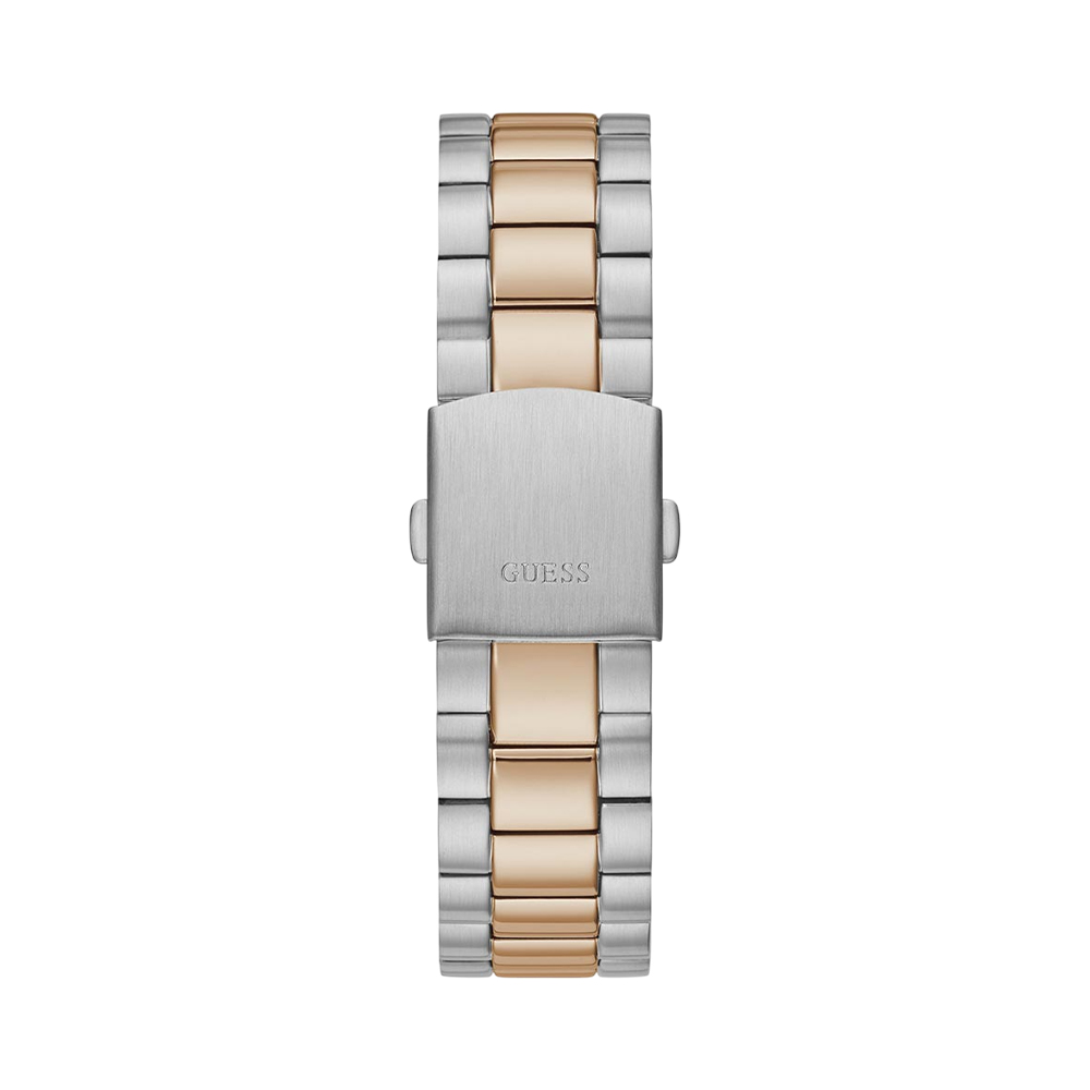 Embrace classic style with a modern twist with the Guess Connoisseur GW0265G12 watch for men. This premium timepiece features a round, two-tone stainless steel case and a distinctive coin-edge bezel. The vibrant blue analog dial with day and date functionality is protected by durable mineral glass. The matching two-tone stainless steel bracelet with a pilot buckle closure ensures a secure and comfortable fit, making this watch an ideal choice for both professional and casual settings. Water-resistant up to 50 meters, this is a versatile and reliable accessory.