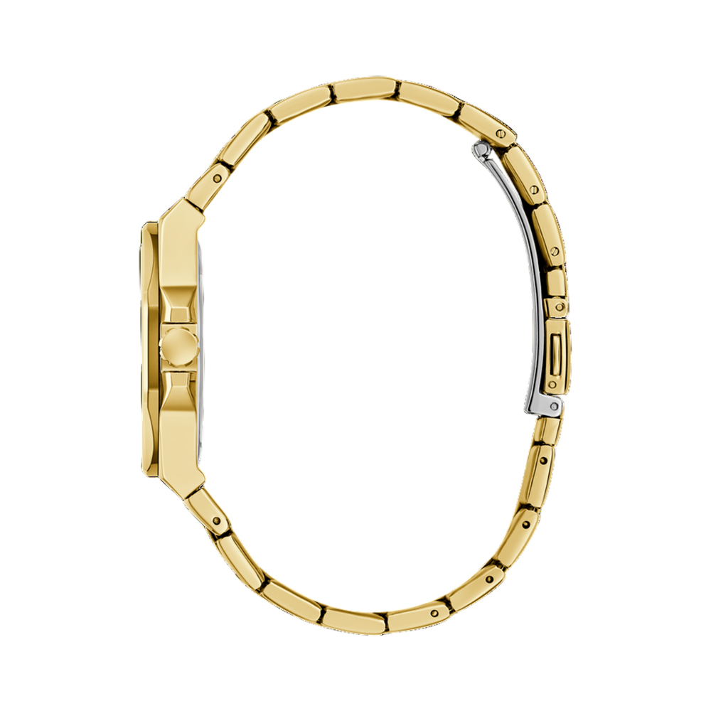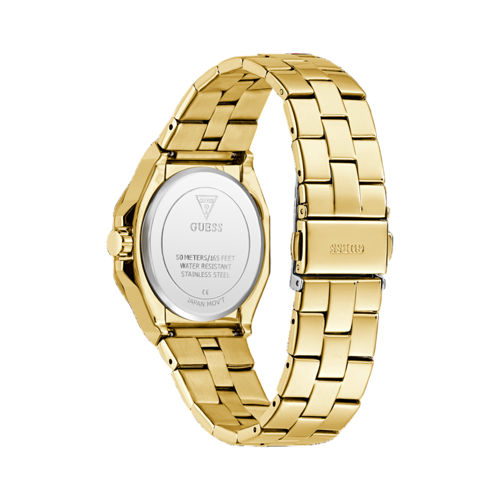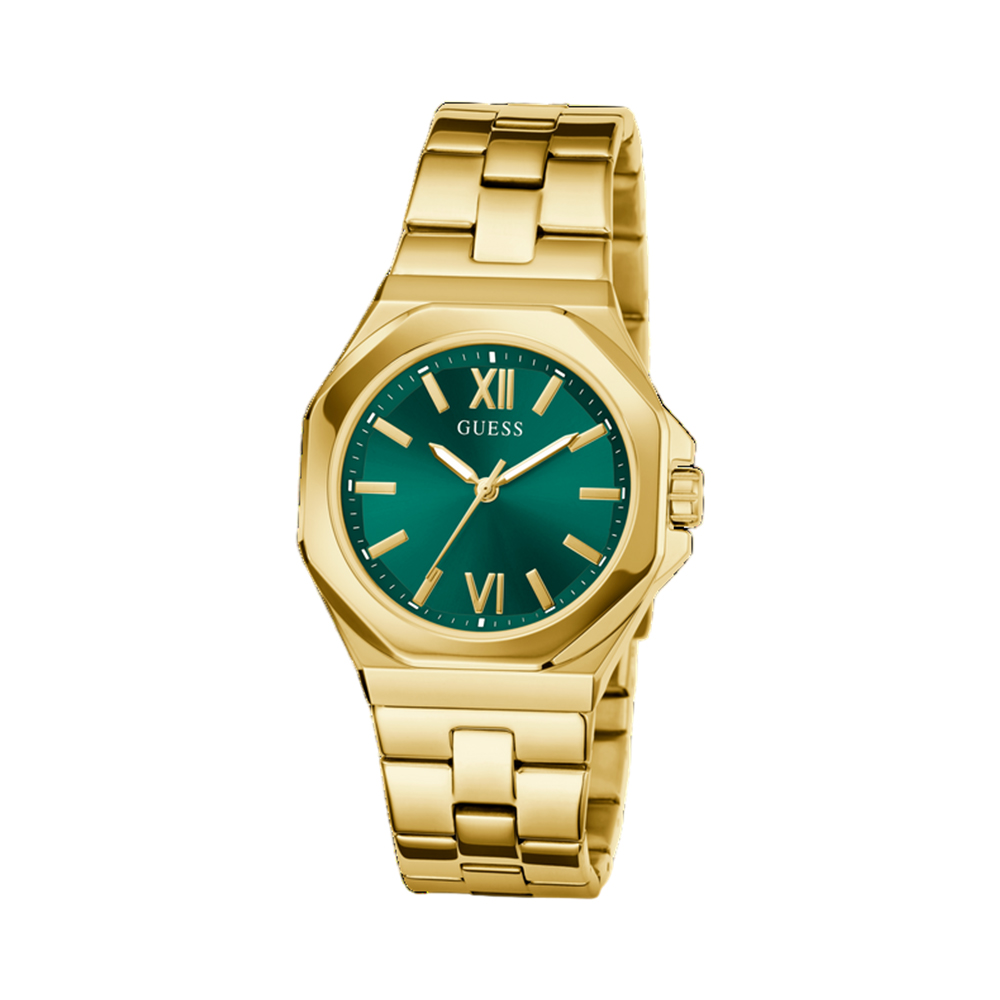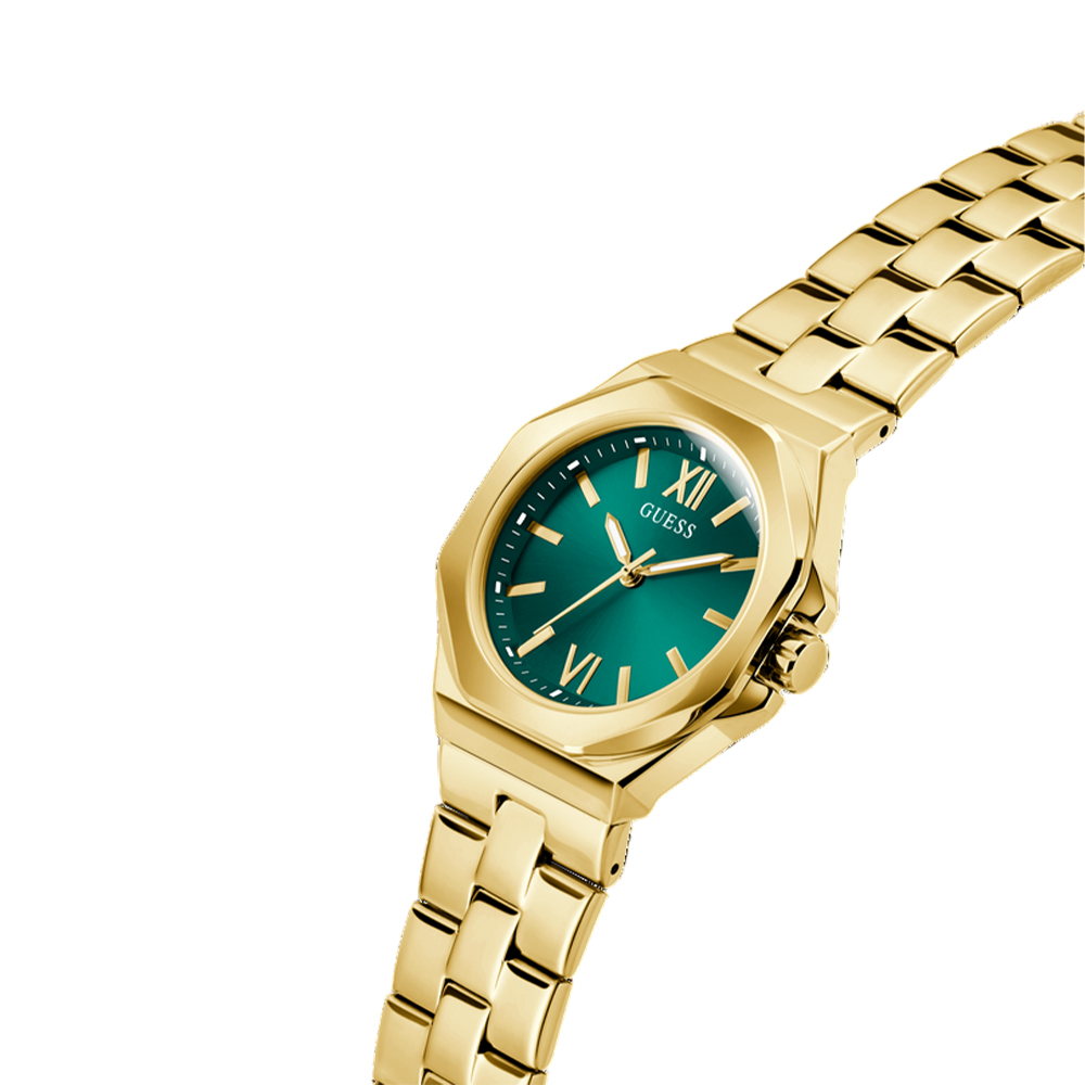 An elegant and sophisticated analog watch for women from the GUESS Empress collection, designed to add a touch of classic charm to any ensemble. This timepiece features a round gold-toned stainless steel case and a polished gold-toned stainless steel bracelet. The green dial with Roman numeral and stick hour markers, protected by mineral glass, creates a vibrant yet refined aesthetic. Powered by a reliable quartz movement and offering 50-meter water resistance, this watch is both fashionable and practical.