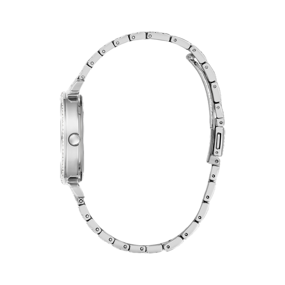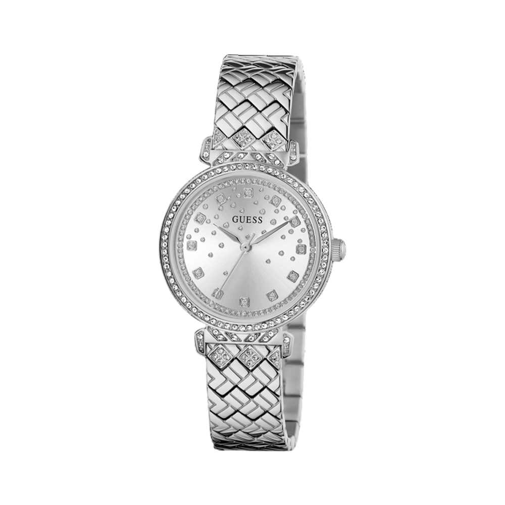 A dazzling and sophisticated analog watch for women from the GUESS Enchantment collection, blending elegance, sustainability, and modern design. This stunning timepiece features a silver-tone recycled stainless steel case with a stoned bezel and a radiant silver dial with a cascading glitz effect. The silver-toned recycled stainless steel bracelet adds to its polished look, making it a perfect accessory for any occasion. With its water resistance and reliable quartz movement, it offers a perfect blend of fashion and functionality.