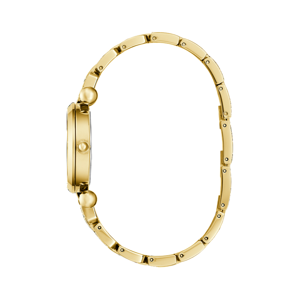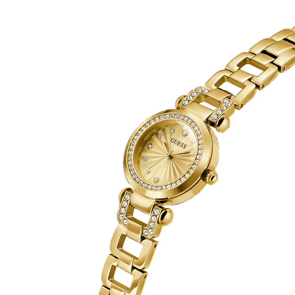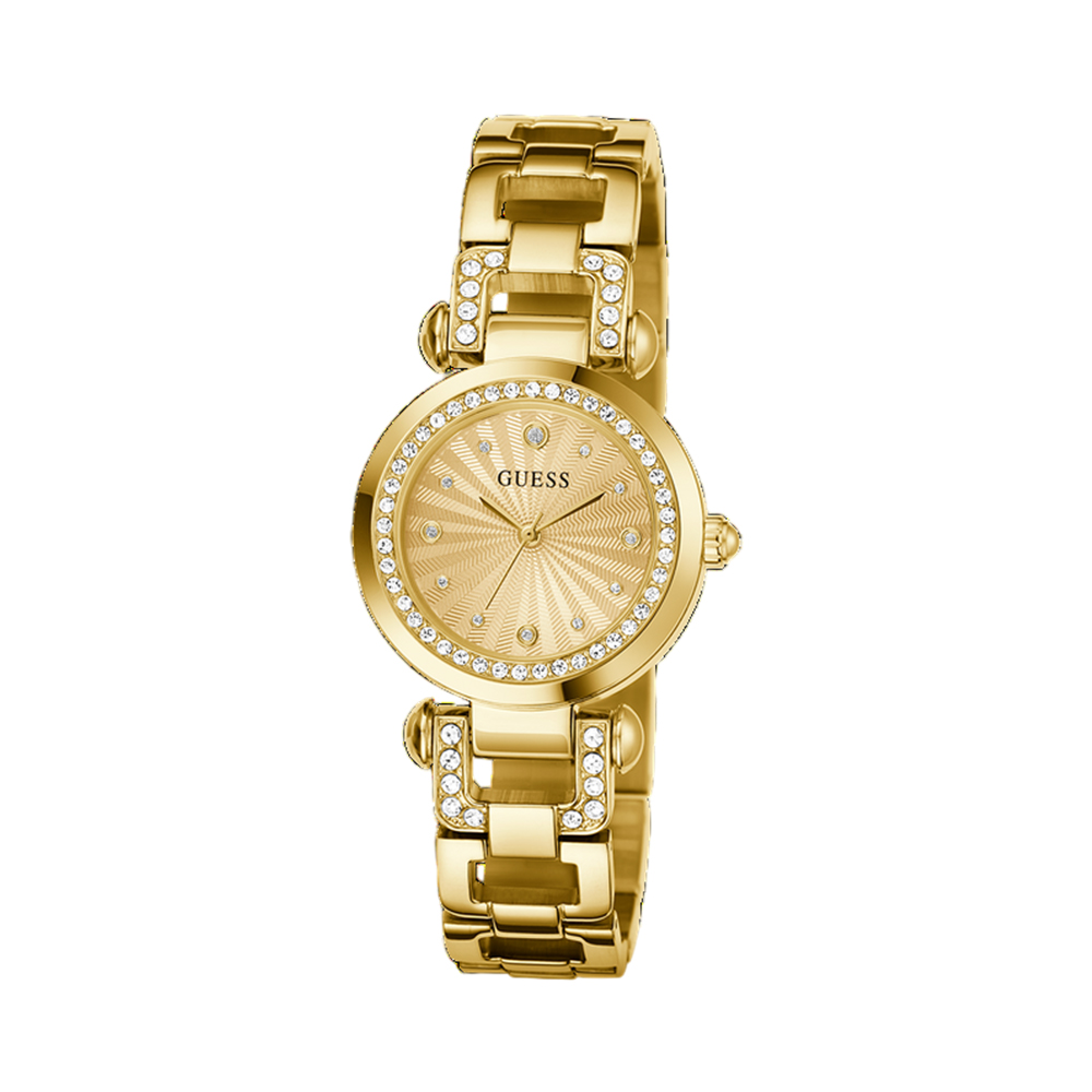 A fashionable and glamorous analog watch for women from the GUESS Ginger collection, designed to make a statement. This timepiece features a gold-toned stainless steel bracelet and a beautiful champagne-colored dial. The round dial is covered by durable mineral glass and powered by a reliable quartz movement, ensuring accurate timekeeping. With its elegant design and comfortable fit, this watch is perfect for adding a touch of sparkle to any outfit.