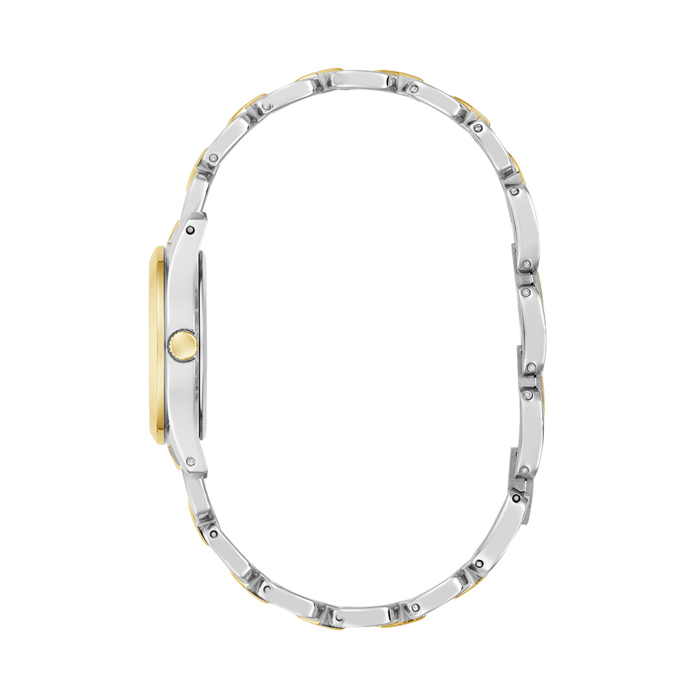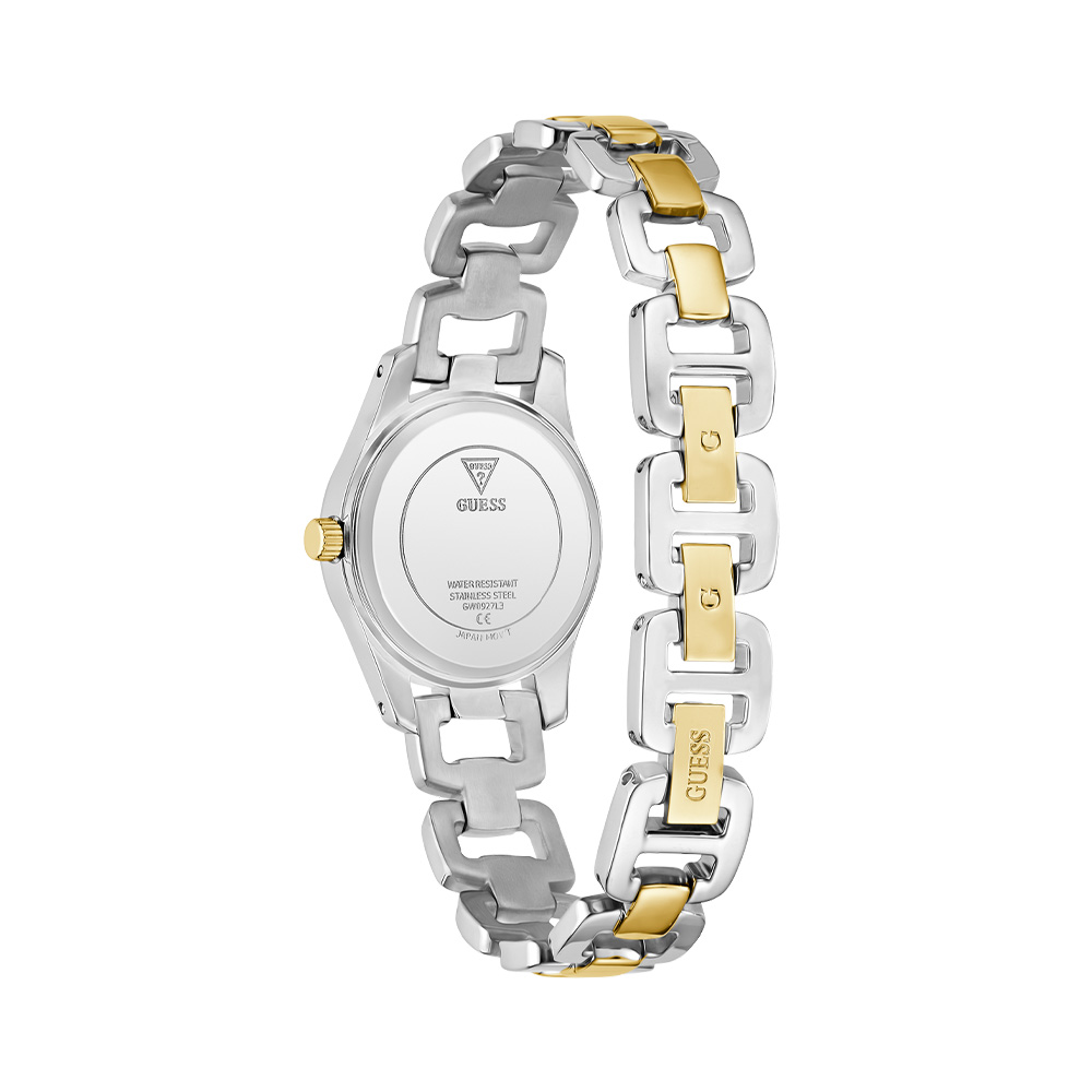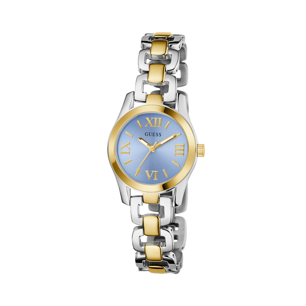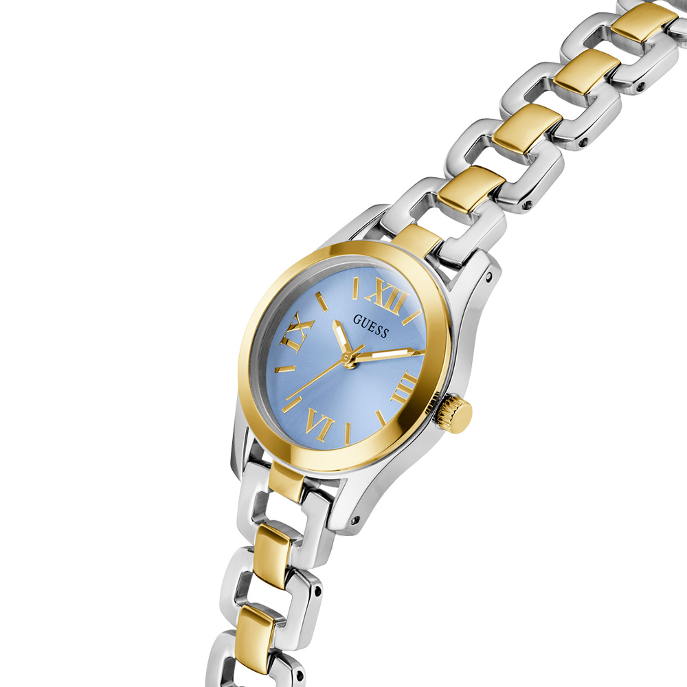 This Guess Ladies 2-Tone Analog Watch features a Ice Blue dial with a 28 mm case, paired with a Stainless Steel strap. Powered by movement and protected by mineral glass, it ensures reliable performance. Water resistance up to makes it suitable for daily use.