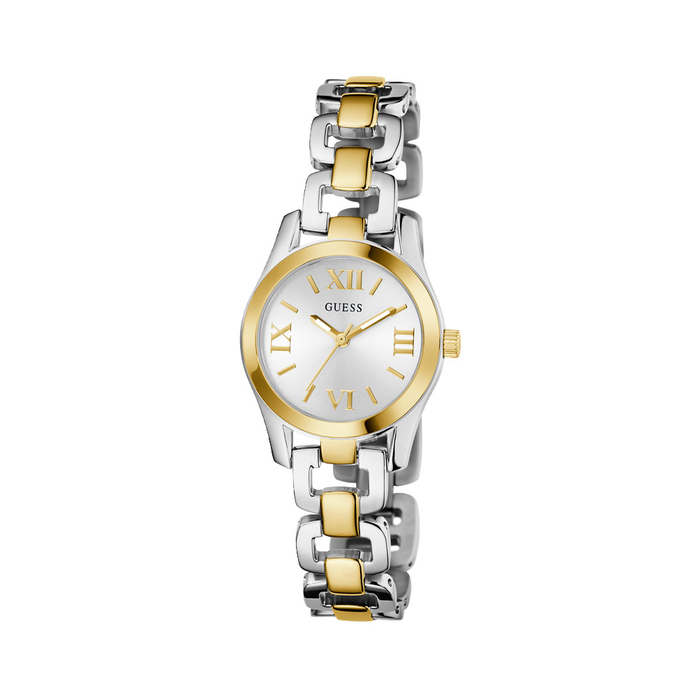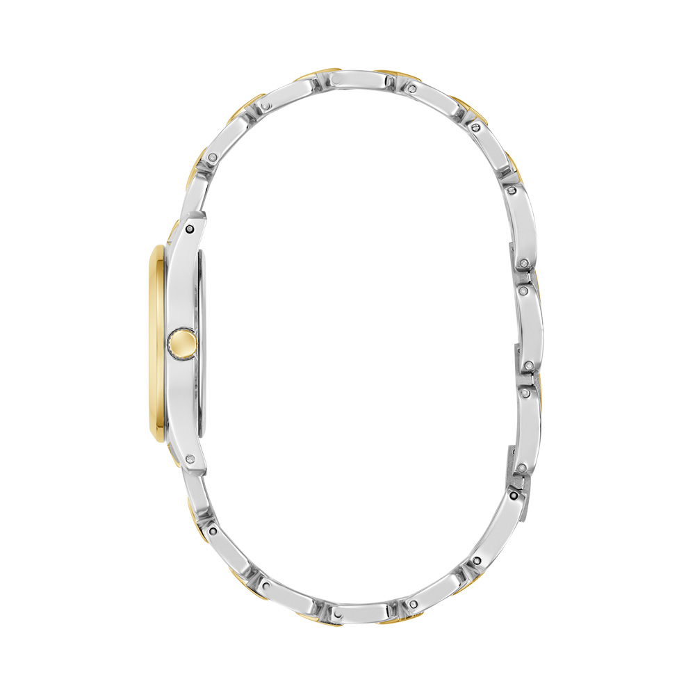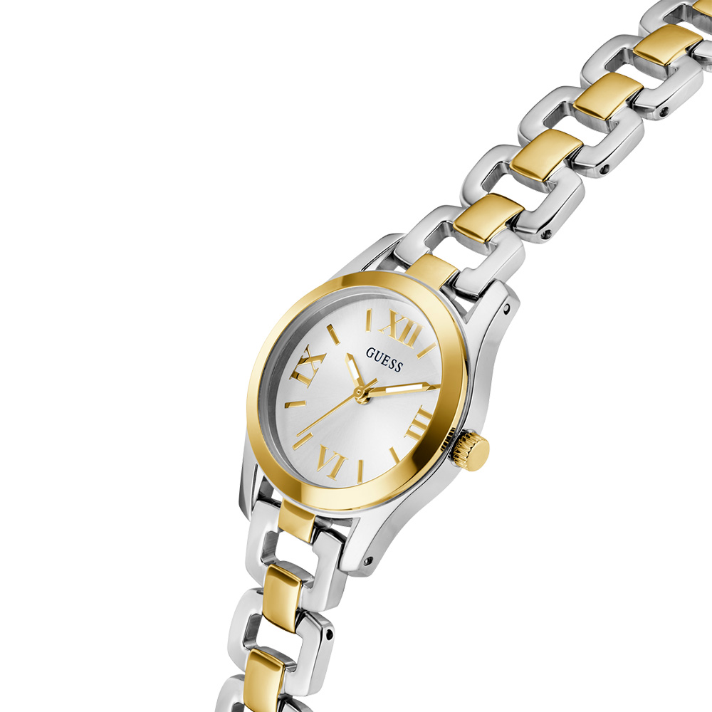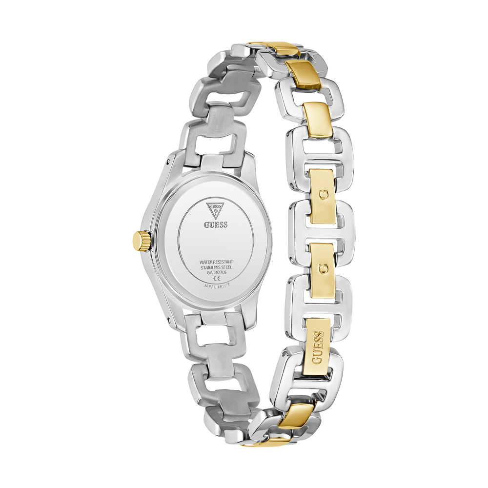 This Guess Ladies 2-Tone Analog Watch features a Silver dial with a 28 mm case, paired with a Stainless Steel strap. Powered by movement and protected by mineral glass, it ensures reliable performance. Water resistance up to makes it suitable for daily use.