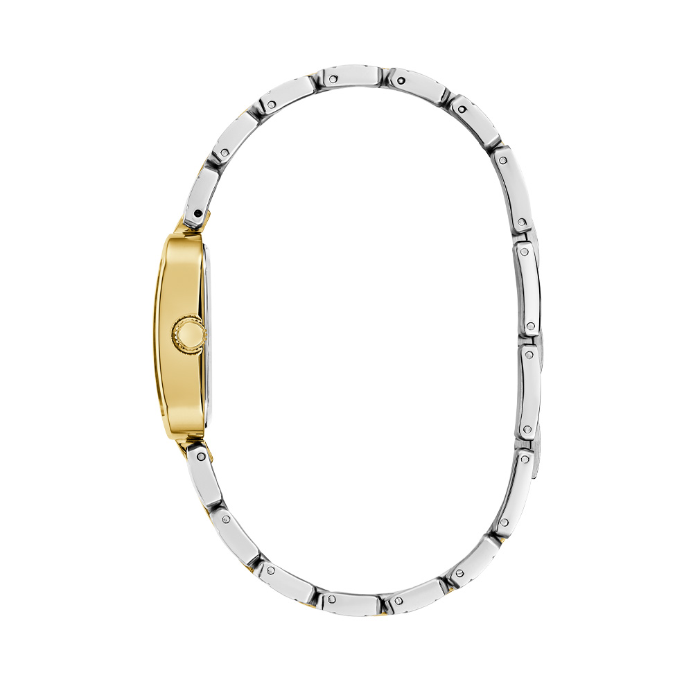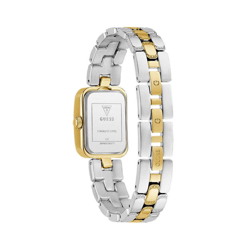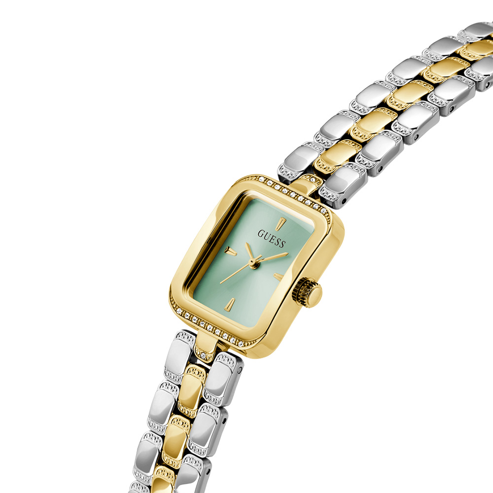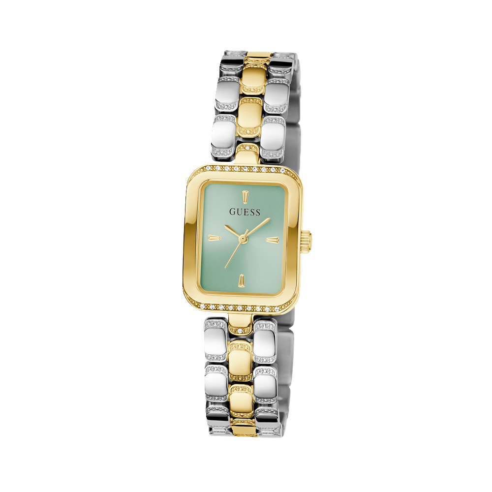 This Guess Ladies 2-Tone Gold Tone Analog Watch features a Green dial with a 22 mm case, paired with a Stainless Steel strap. Powered by movement and protected by mineral glass, it ensures reliable performance. Water resistance up to makes it suitable for daily use.