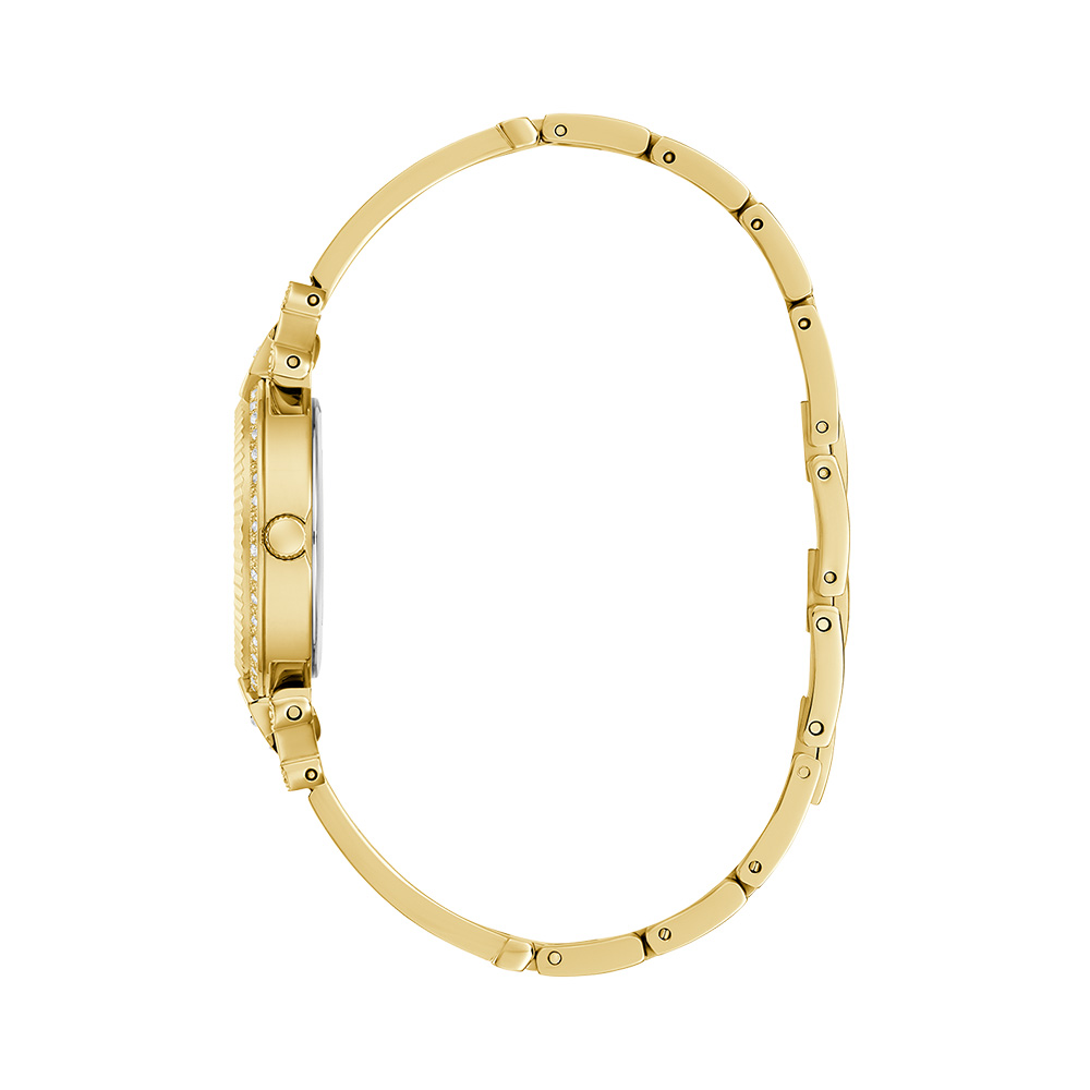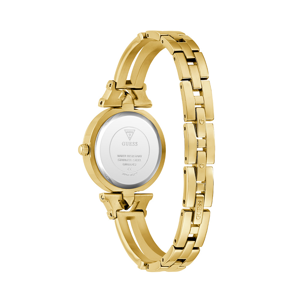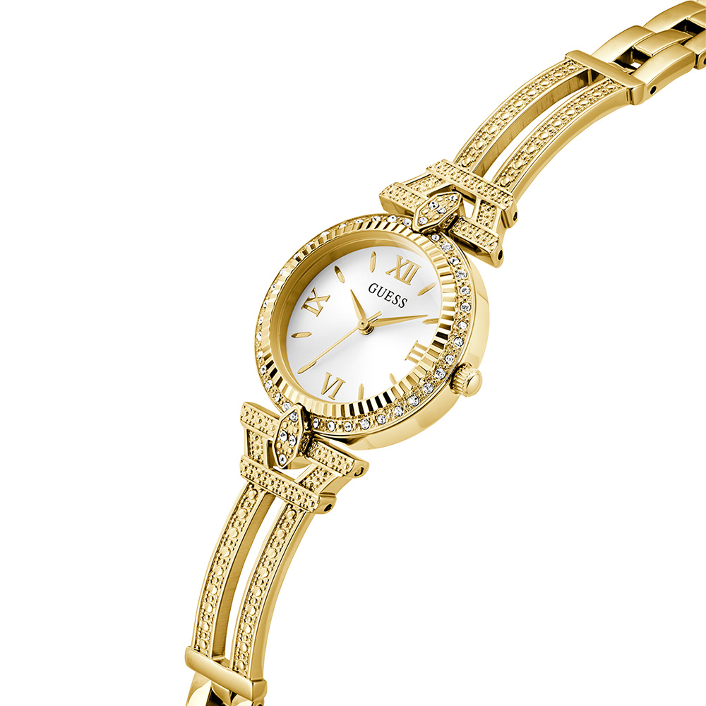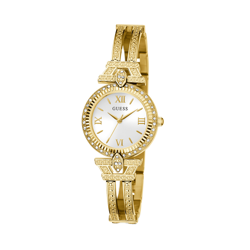 This Guess Ladies Gold Tone Analog Watch features a White dial with a 28 mm case, paired with a Stainless Steel strap. Powered by movement and protected by mineral glass, it ensures reliable performance. Water resistance up to makes it suitable for daily use.