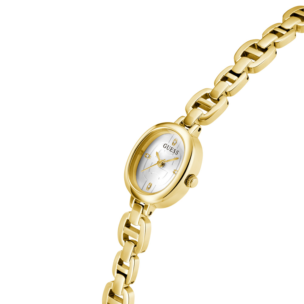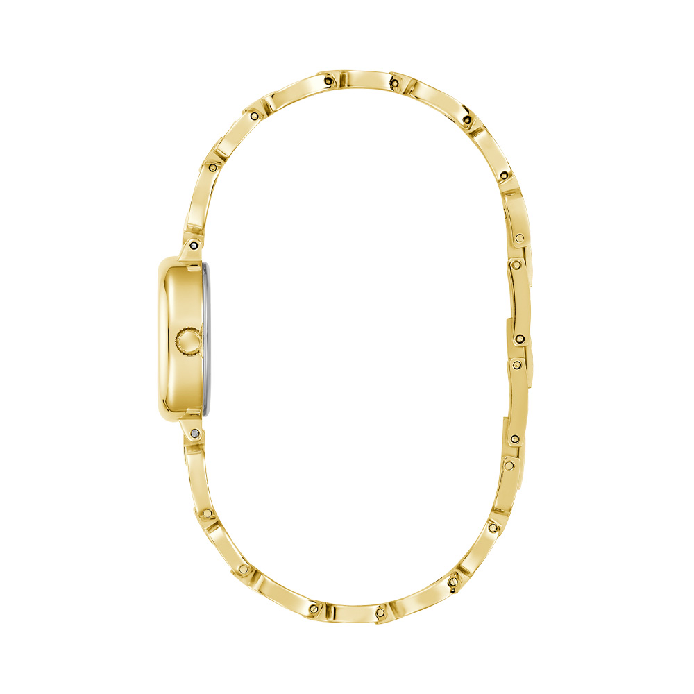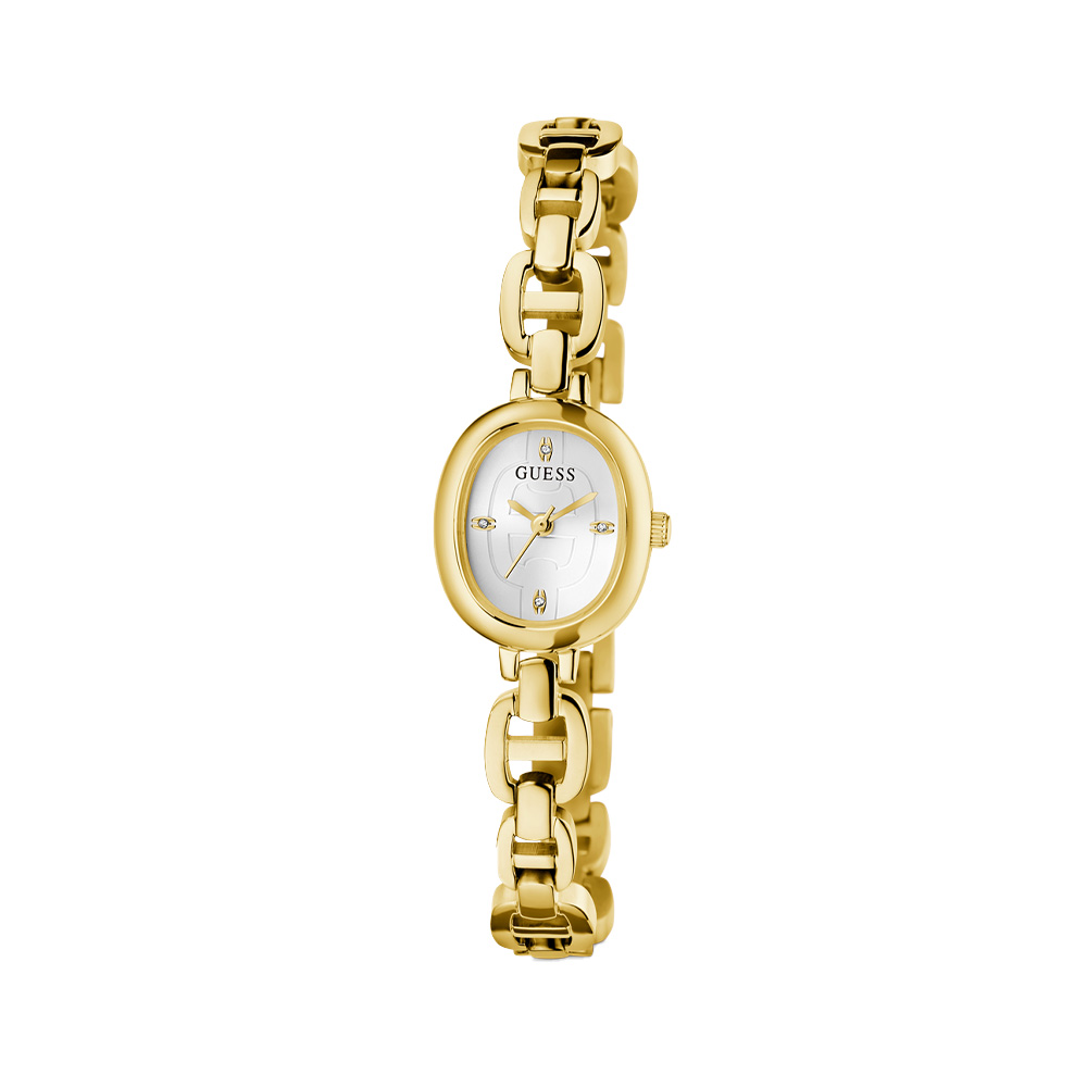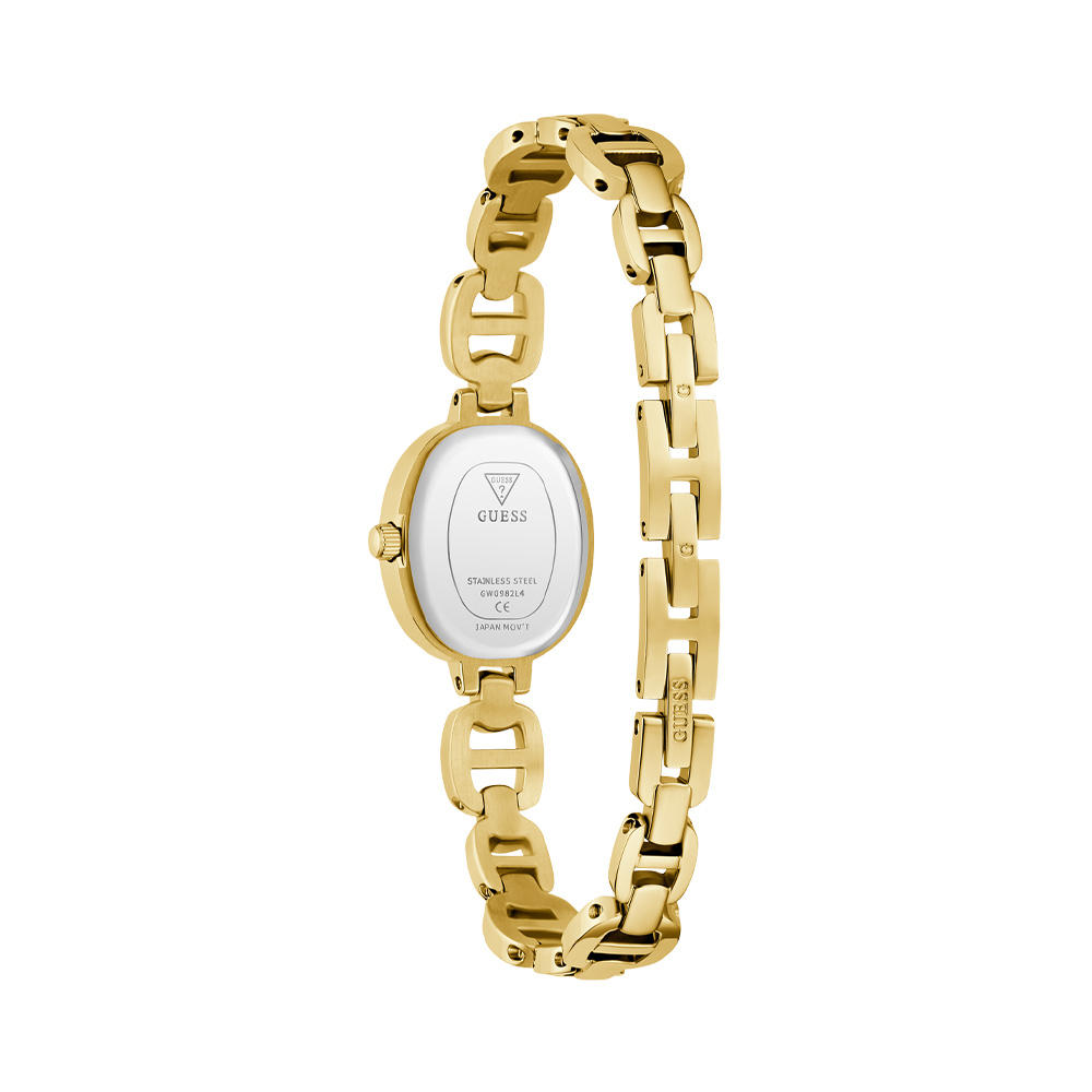 This Guess Ladies Gold Tone Analog Watch features a White dial with a 21 mm case, paired with a Stainless Steel strap. Powered by movement and protected by mineral glass, it ensures reliable performance. Water resistance up to makes it suitable for daily use.