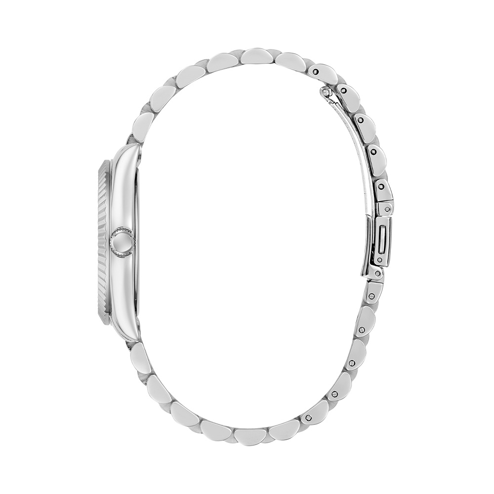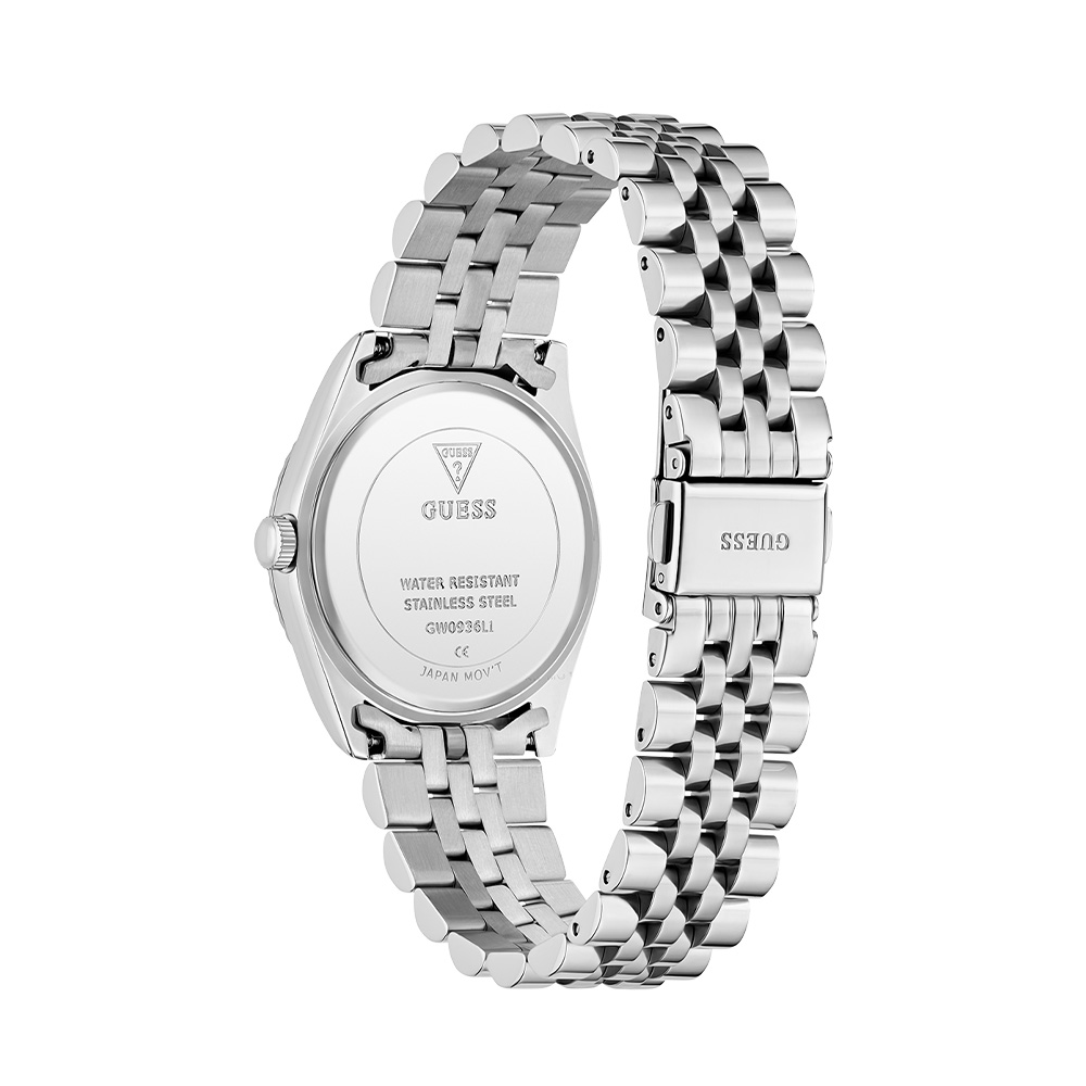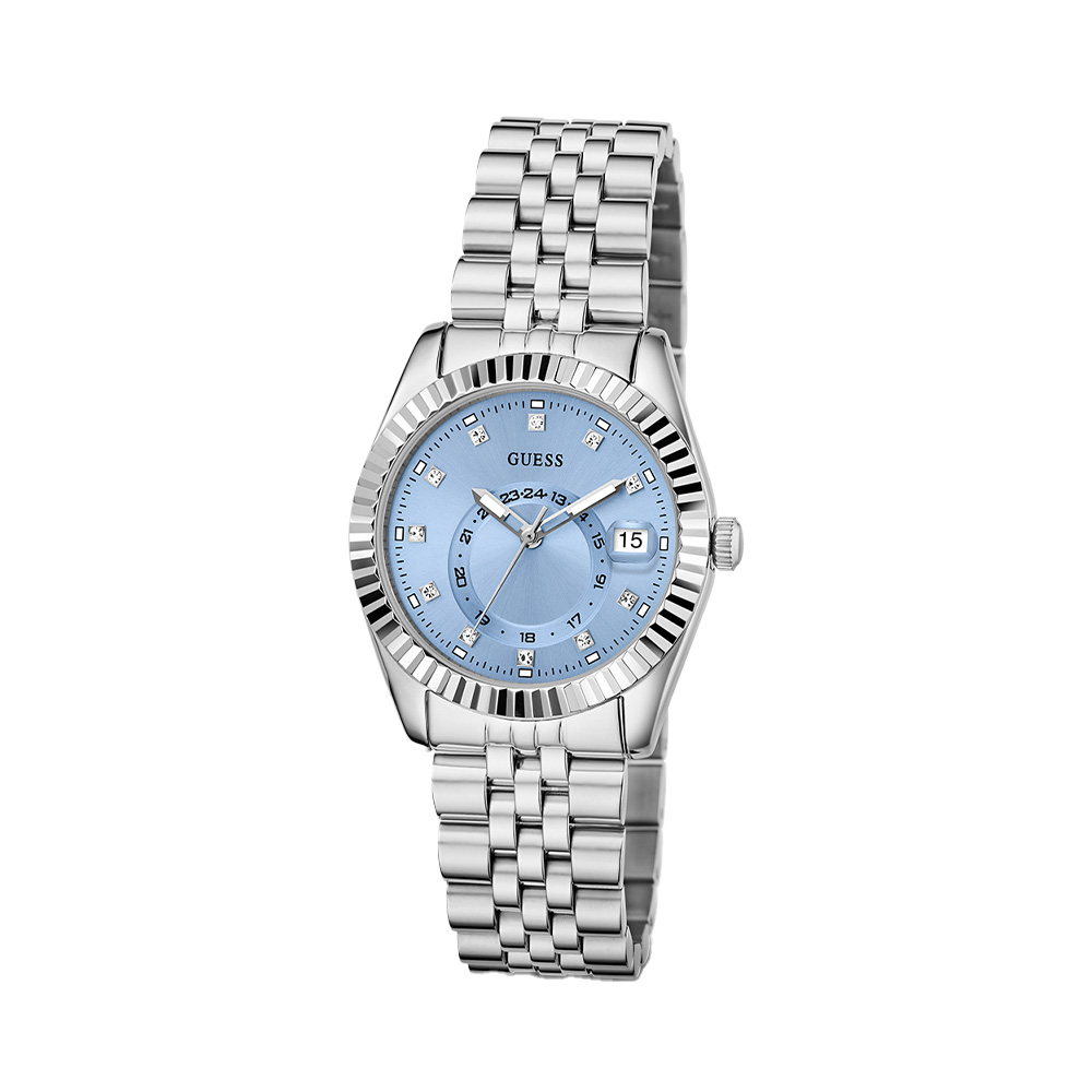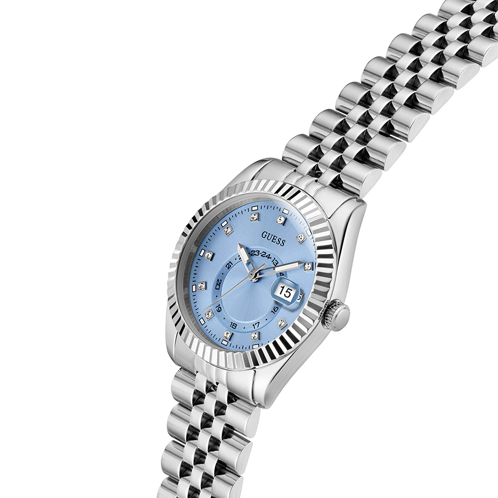 This Guess Ladies Jada Silver Tone Multi-function Date Watch features a Ice Blue dial with a 34 mm case, paired with a Stainless Steel strap. Powered by movement and protected by mineral glass, it ensures reliable performance. Water resistance up to makes it suitable for daily use.