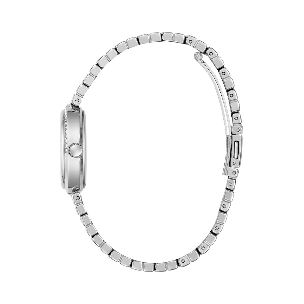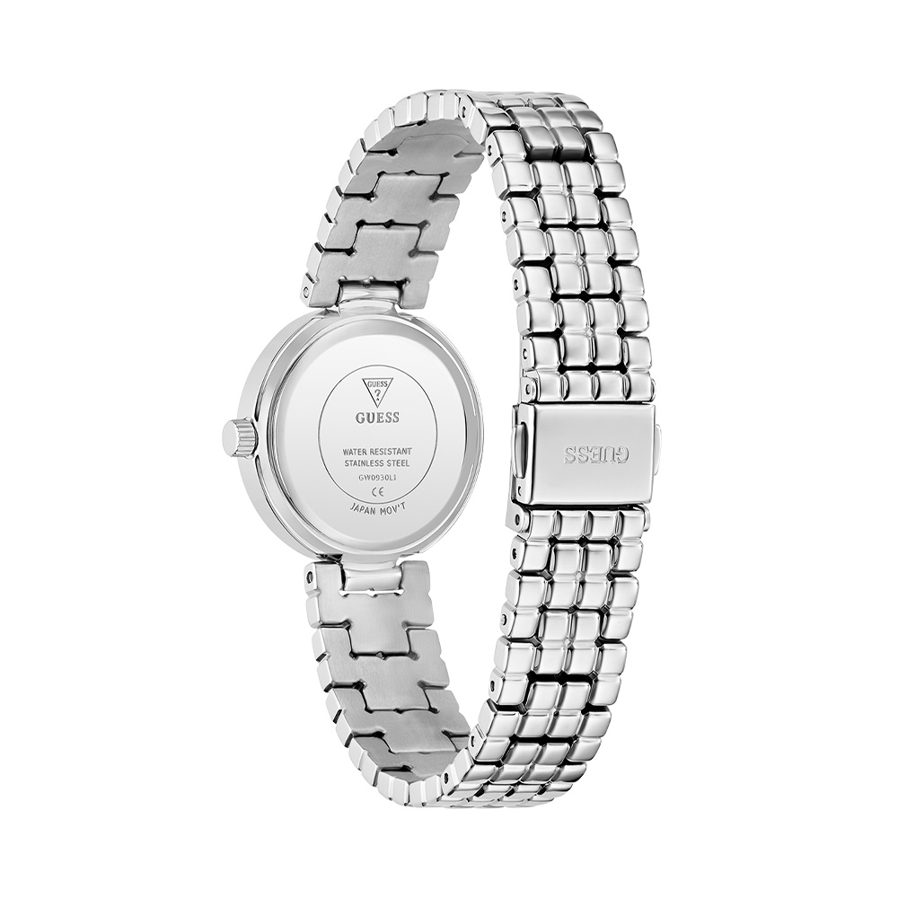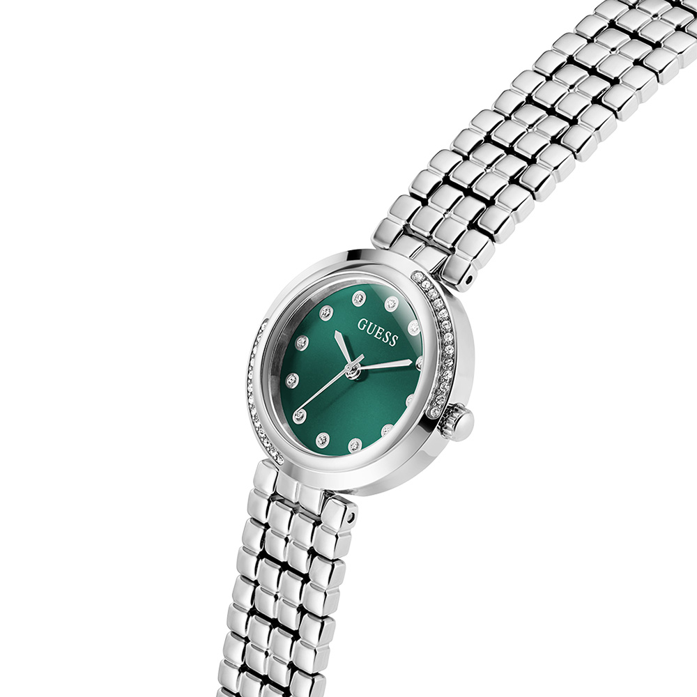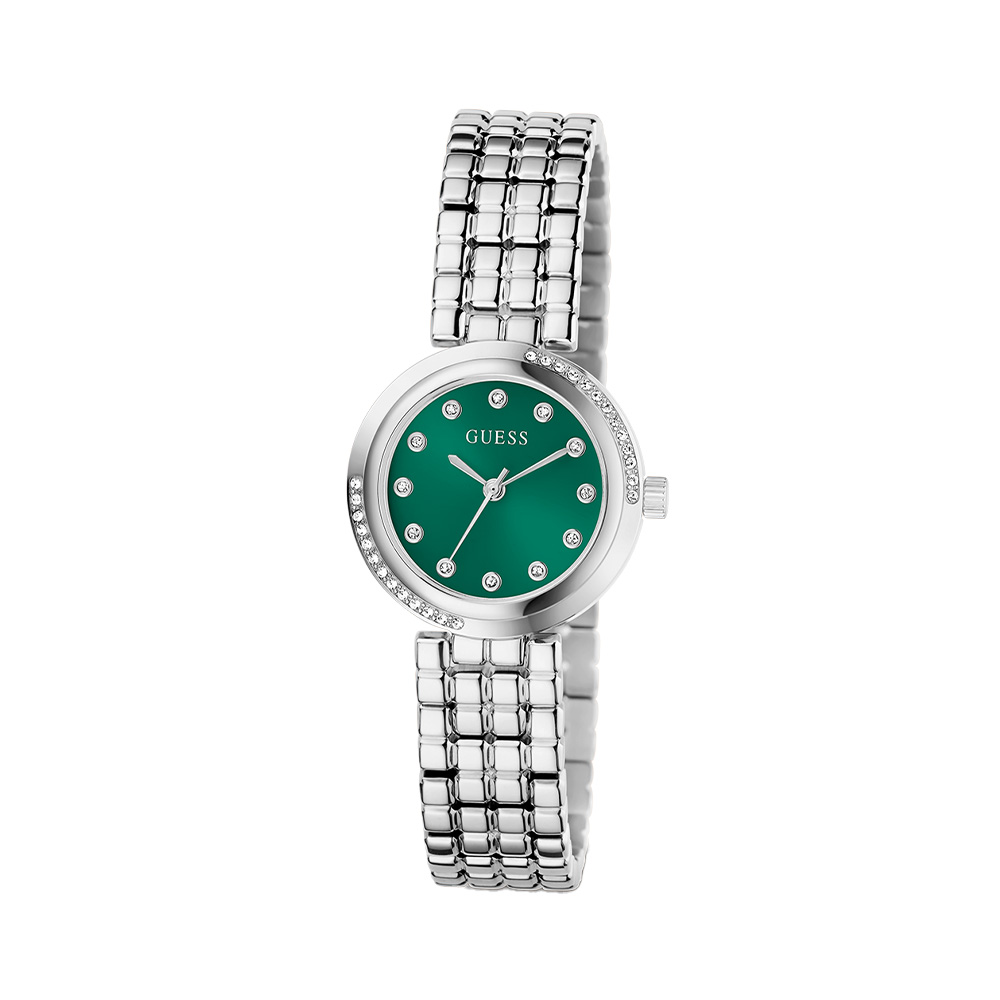 This Guess Ladies Silver Tone Analog Watch features a Green dial with a 28 mm case, paired with a Stainless Steel strap. Powered by movement and protected by mineral glass, it ensures reliable performance. Water resistance up to makes it suitable for daily use.