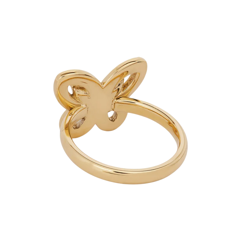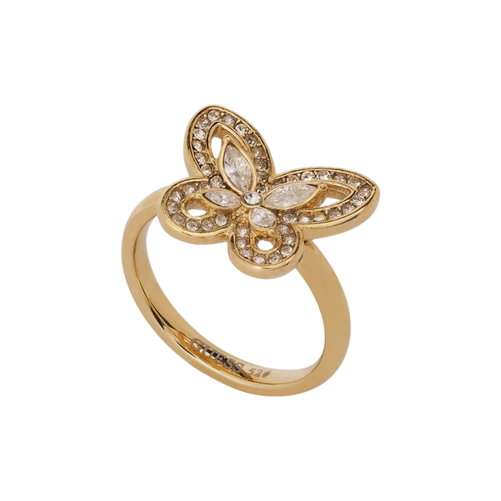 The GUESS Lily Butterfly Ring JUBR05115JWYG52 is a sophisticated accessory designed to capture attention. Crafted from durable metal with a radiant yellow gold finish, this ring showcases an intricately embellished butterfly motif that embodies femininity and style. The design incorporates subtle sparkle within the pattern, adding a playful yet sophisticated touch. Available in size 52, this piece offers a comfortable fit and seamlessly blends casual charm with elegant flair, making it an essential addition to a modern woman's jewelry collection.