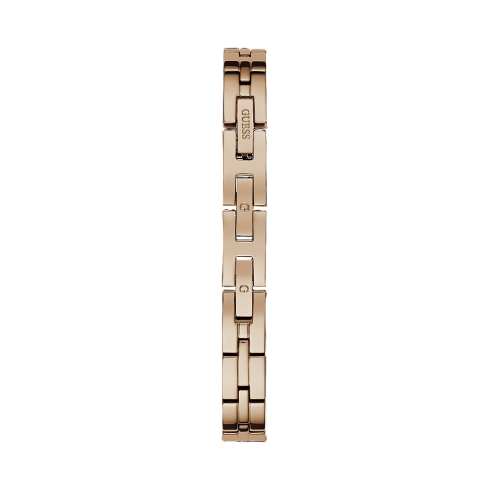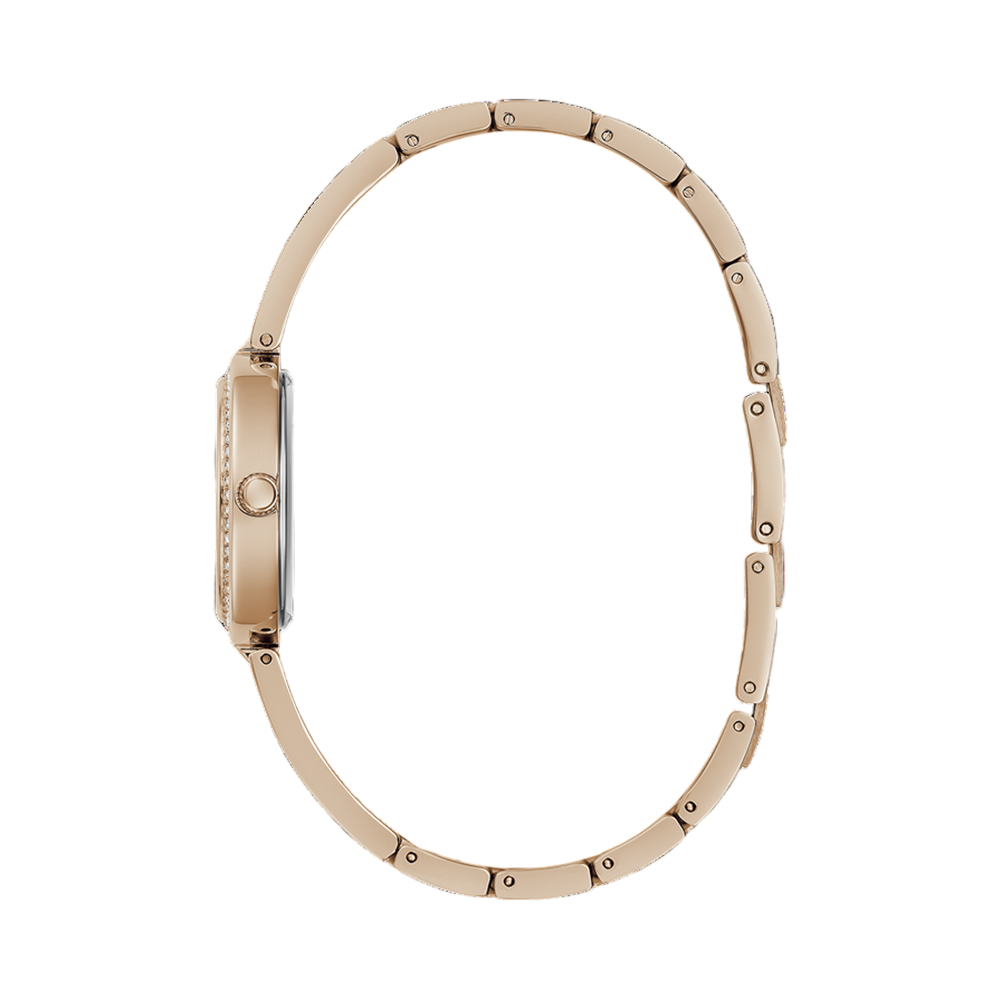 This analog watch from GUESS is a perfect addition to any timepiece collection, seamlessly fusing fashion with functionality to create a bold, trendsetting aesthetic. It is a versatile accessory that captures the essence of modern sophistication and youthful energy. The watch features a classic round white dial set within a durable 27mm stainless steel case. Its elegant rose gold-toned, G-link bracelet adds a touch of glamour, making it a statement piece for any occasion. The watch is powered by a reliable quartz movement and is designed for the modern woman who appreciates style, sophistication, and a touch of eco-consciousness.