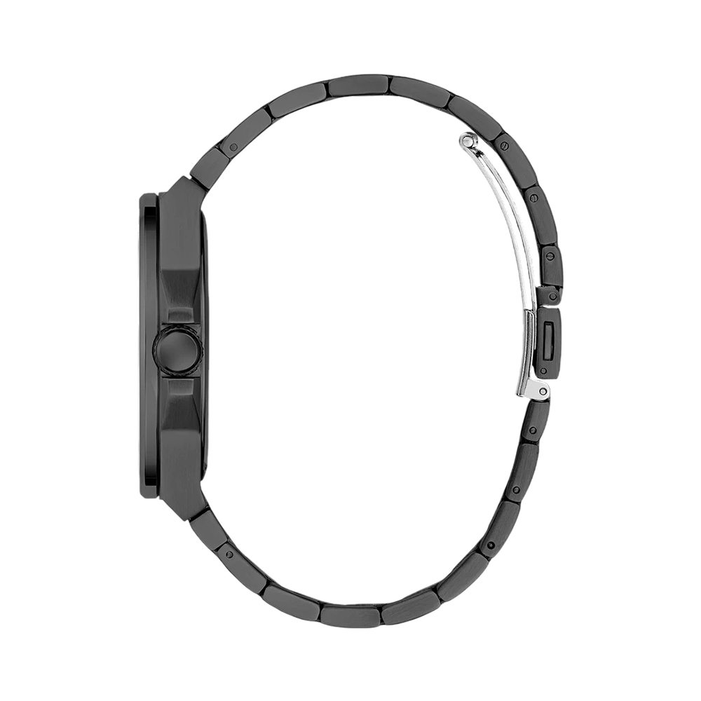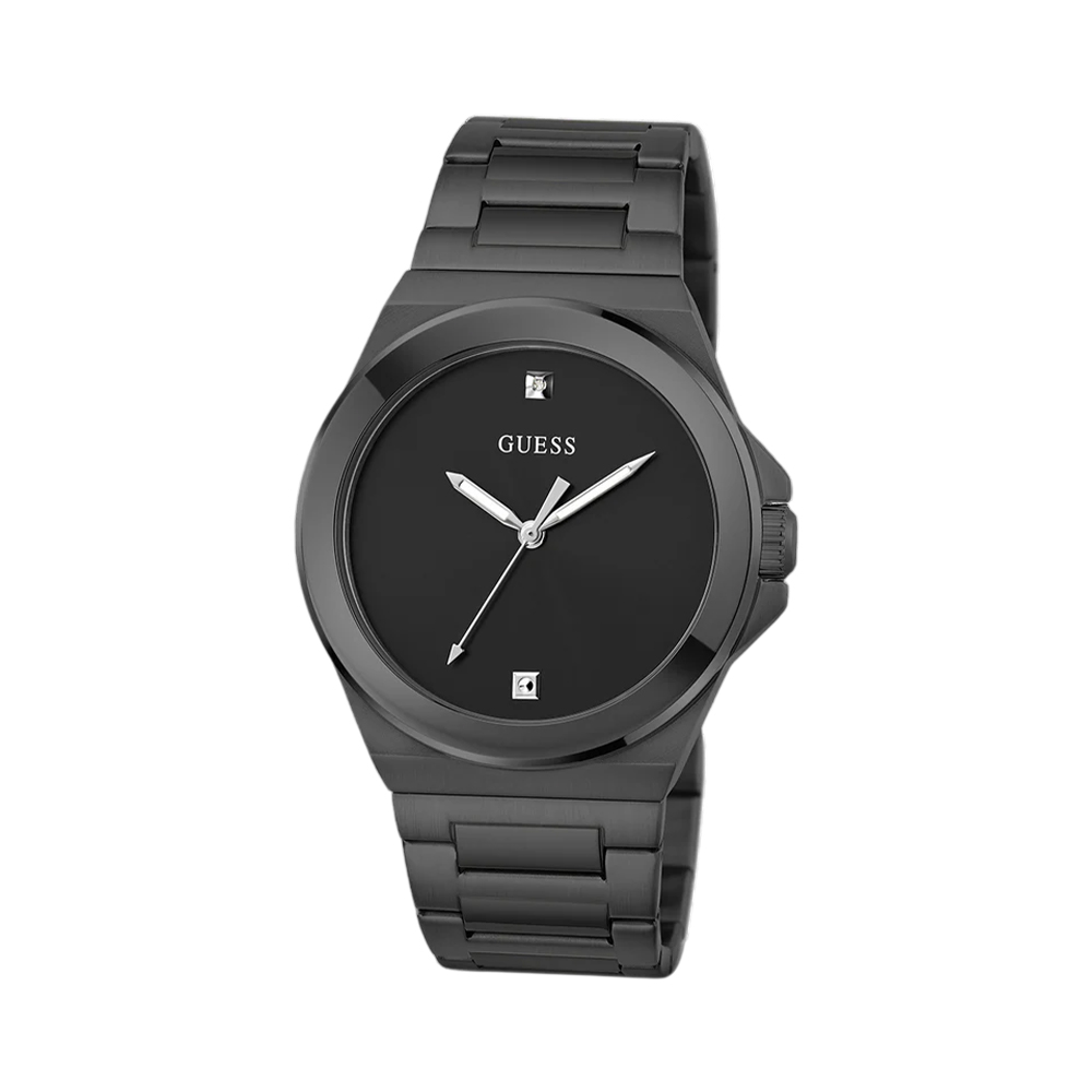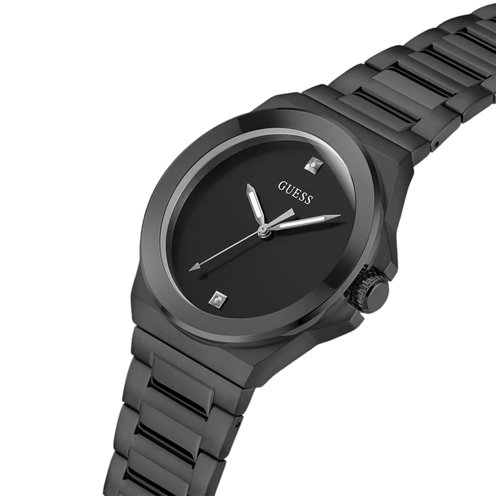 The GUESS Watch GW0833G2 is a sophisticated timepiece blending rugged style with a touch of luxury. It features a 44 mm round stainless steel case with a brushed and polished black finish, complemented by a matching black dial adorned with a genuine diamond accent. Powered by a high-precision quartz analog movement and protected by scratch-resistant mineral crystal, this watch is designed for everyday durability. The black stainless steel bracelet is secured by a practical pilot buckle, and it offers 3 ATM water resistance, making it both a durable and stylish statement piece for the modern man.
