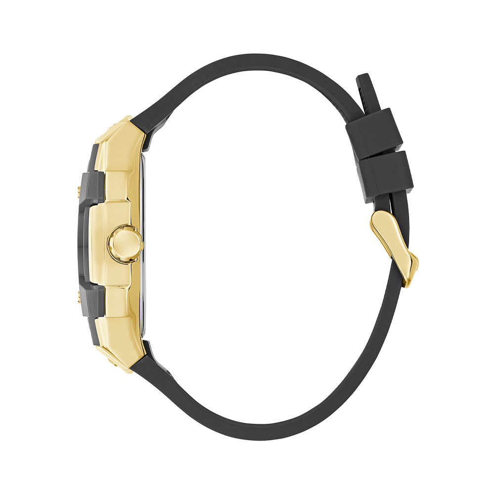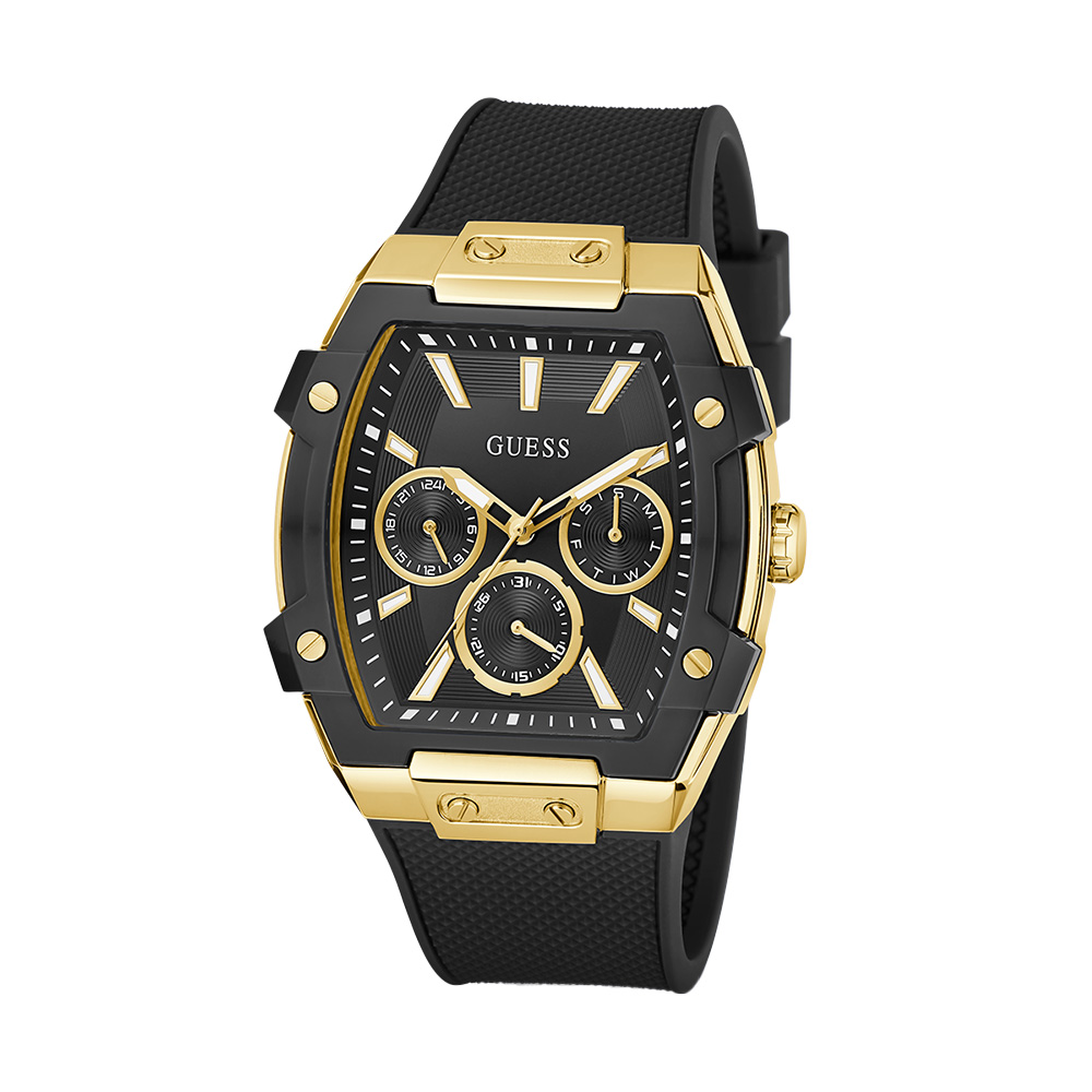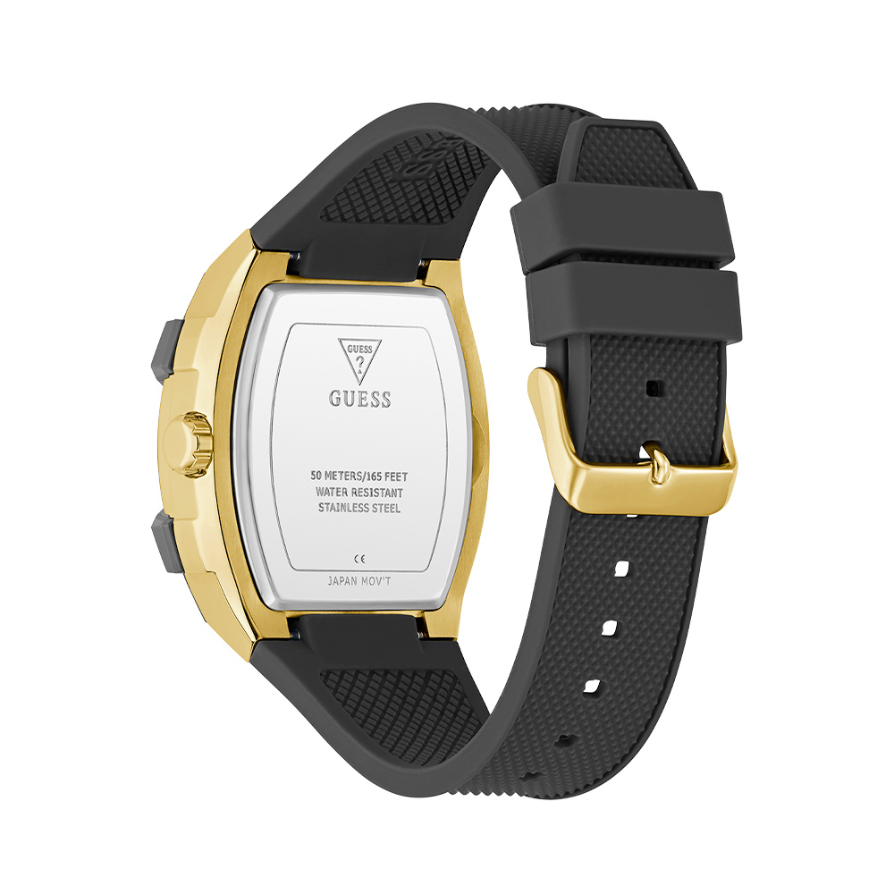 This Guess Mens Black Gold Tone Multi-function Watch features a Black dial with a 44 mm case, paired with a Silicone strap. Powered by movement and protected by mineral glass, it ensures reliable performance. Water resistance up to makes it suitable for daily use.
