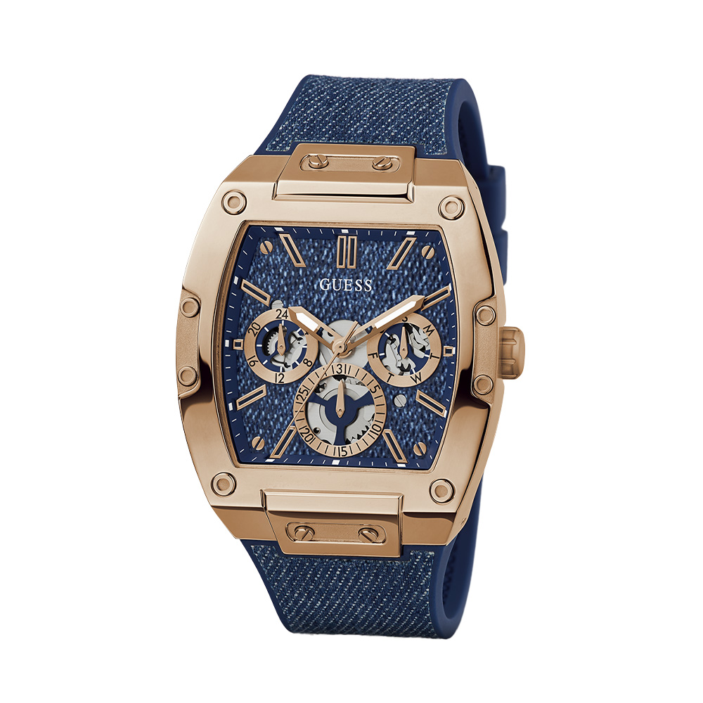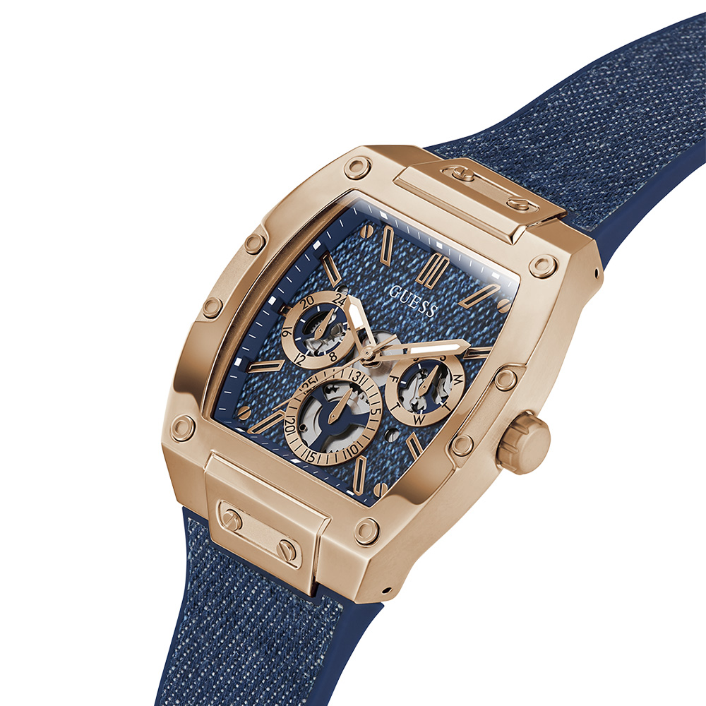This Guess Mens Blue Rose Gold Tone Multi-function Watch features a Blue dial with a 42 mm case, paired with a Denim/Silicone strap. Powered by movement and protected by mineral glass, it ensures reliable performance. Water resistance up to makes it suitable for daily use.