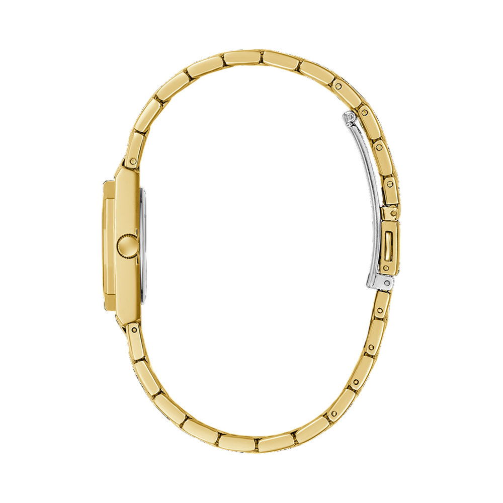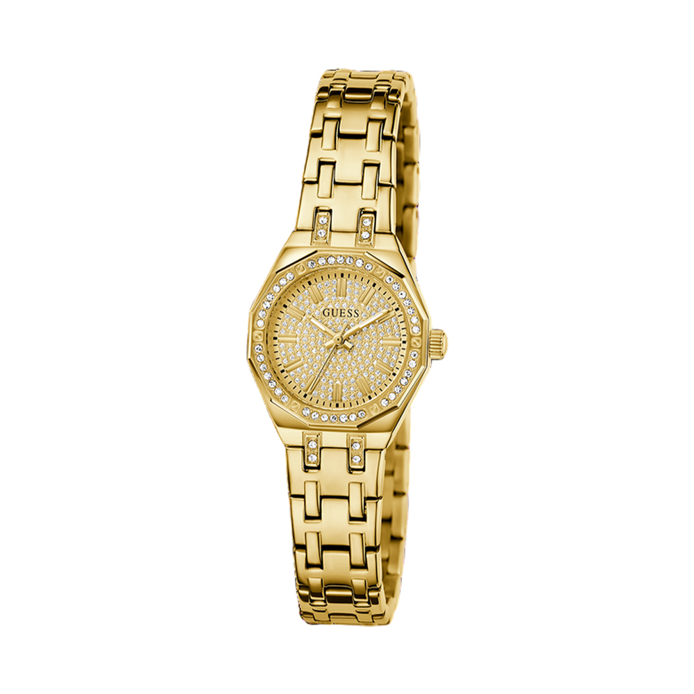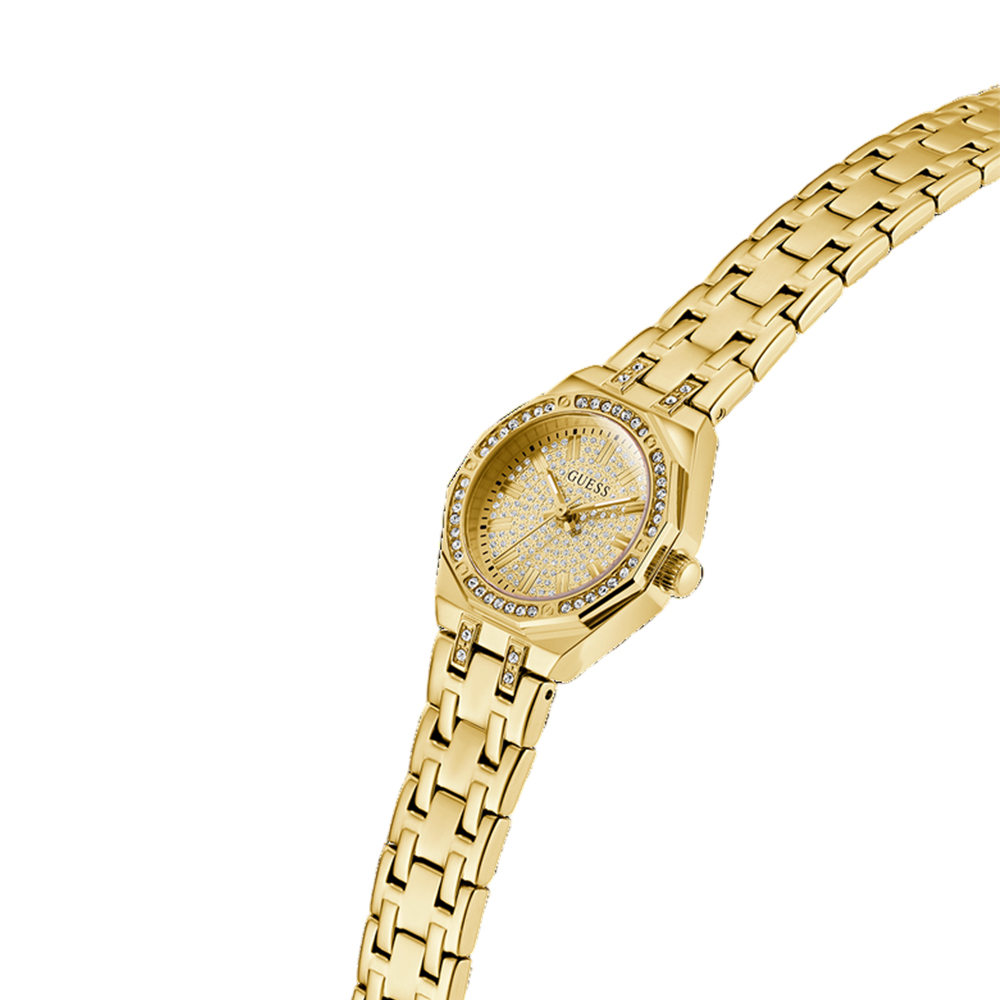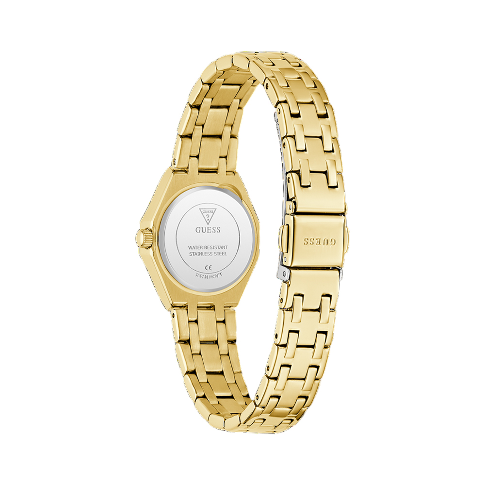 A chic and trendy analog watch for women from the GUESS Pixie collection, designed to add a touch of sparkle to your wrist. This timepiece features a beautiful gold-tone case with a crystal-studded bezel and a luxurious champagne dial. The watch is paired with a matching gold-tone stainless steel bracelet, creating a sophisticated and polished look. With its high-quality mineral glass and quartz movement, this watch is both fashionable and reliable.