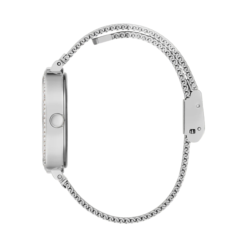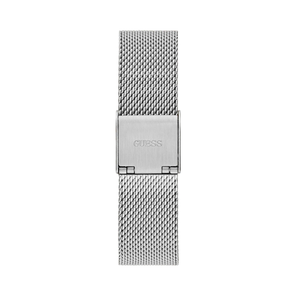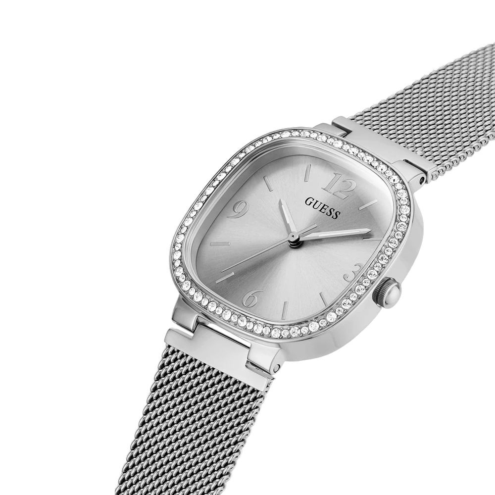 The GUESS Square Mesh Watch GW0354L1 is a refined GUESS timepiece that blends geometric modernism with classic silver elegance. It features a polished 32 mm square stainless steel case and a matching silver sunray dial. The GUESS watch is complemented by a flexible stainless steel mesh strap that provides a comfortable and adjustable fit. Powered by a high-precision quartz analog movement and protected by scratch-resistant mineral crystal, this GUESS watch is built for daily durability. With 3 ATM water resistance, it is a versatile accessory designed for the modern woman who values minimalist sophistication and reliable performance.