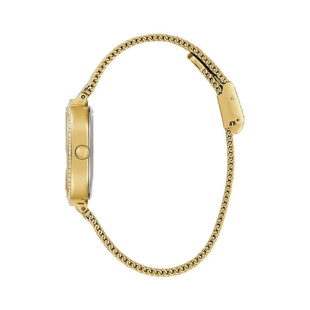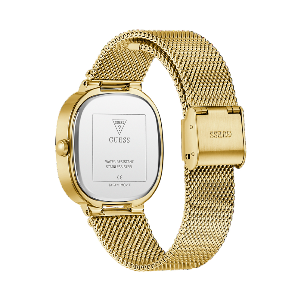 A stylish and versatile analog watch for women from the GUESS Tapestry collection. This timepiece features a square case made from recycled steel with a polished gold-tone finish and a sleek gold-tone bracelet, showcasing a modern and eco-conscious design. The blue analog dial is protected by durable mineral glass and powered by a reliable quartz movement. With its water resistance up to 30 meters, this watch is both fashionable and practical for any occasion.