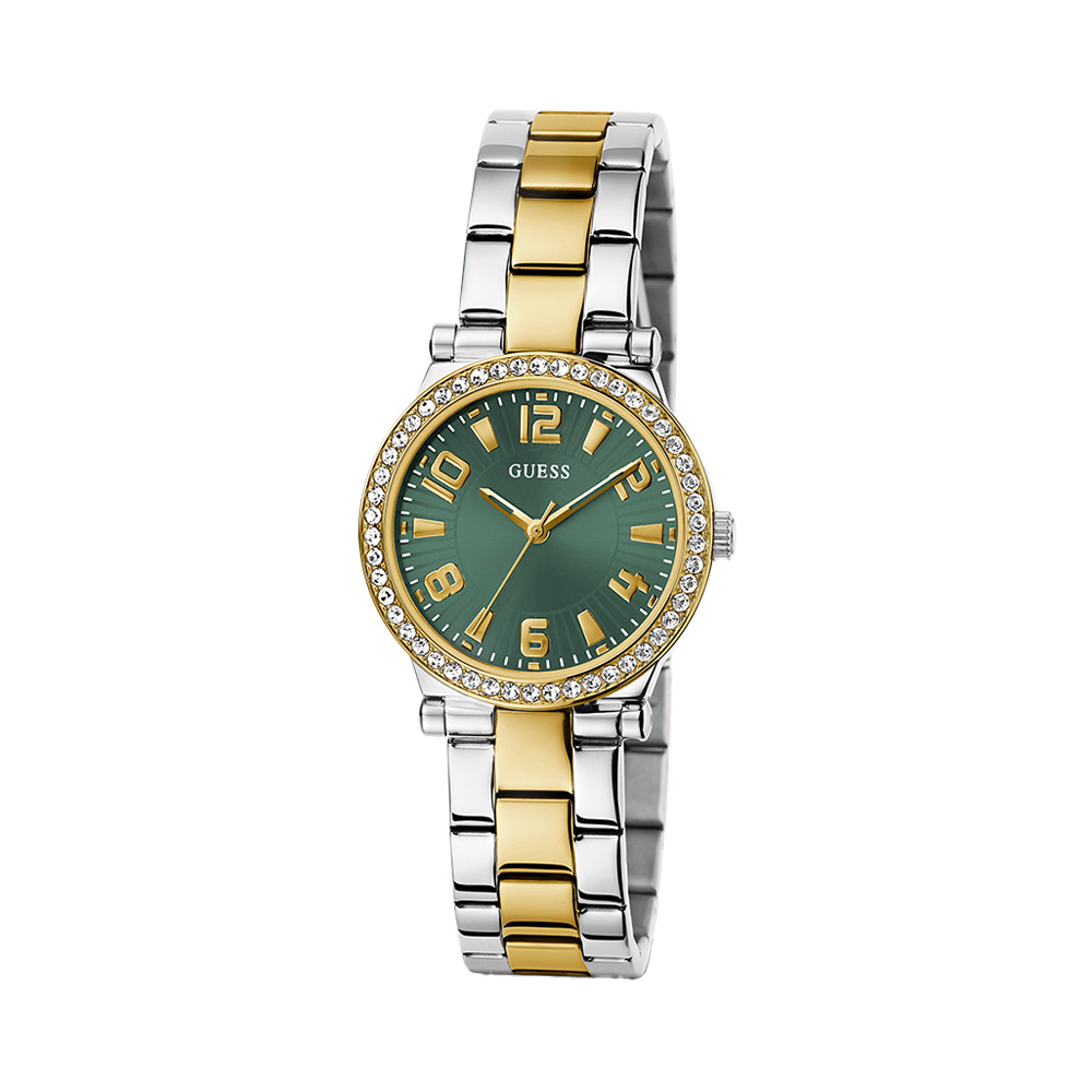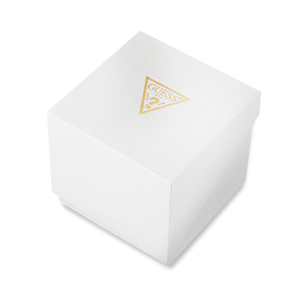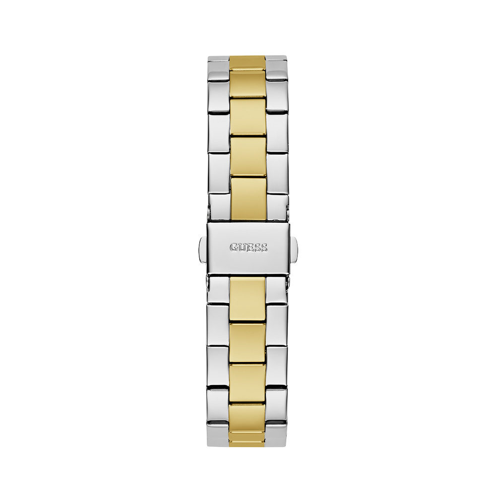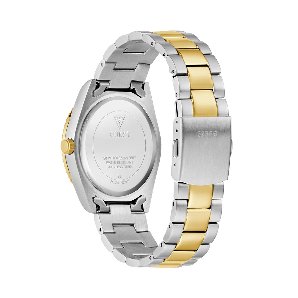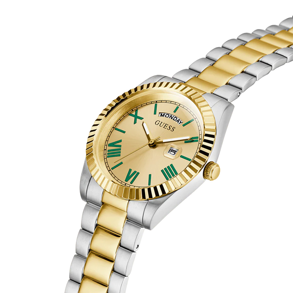 This Guess men’s watch features a refined champagne dial with a day window at 12 o’clock and a date display at 3 o’clock, offering both style and practicality. The 42mm stainless steel case with a coin edge bezel is paired with a brushed and polished two-tone bracelet for a sophisticated look. Protected by durable mineral glass and powered by a precise quartz movement, it ensures reliable timekeeping. With water resistance up to 5 ATM, this watch is suitable for everyday wear and light swimming.