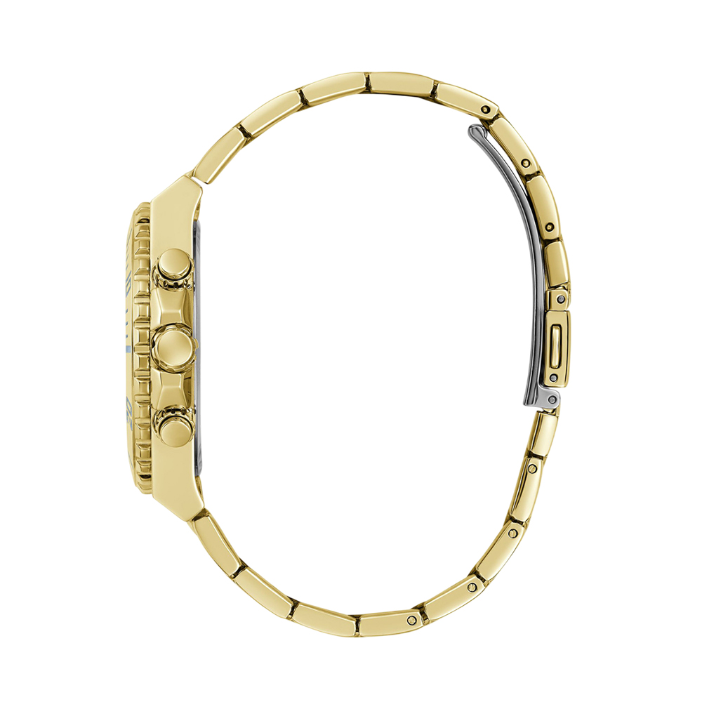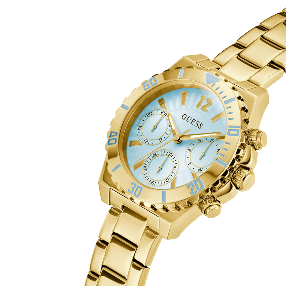 The GUESS Multi-Function Watch GW0696L2 is a vibrant and practical GUESS timepiece showcasing a 38 mm round stainless steel case with a bold blue dial featuring calendar and time reset functions. Powered by a precision quartz movement, this GUESS watch is paired with a gold-toned stainless steel bracelet strap. Secured with a reliable foldover and butterfly clasp, this GUESS watch offers 3 ATM water resistance, making it an ideal accessory for the modern woman who values a blend of luxury aesthetics and functional everyday performance.