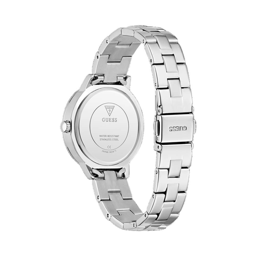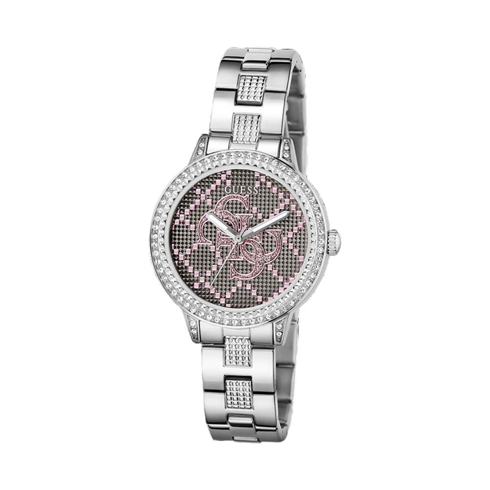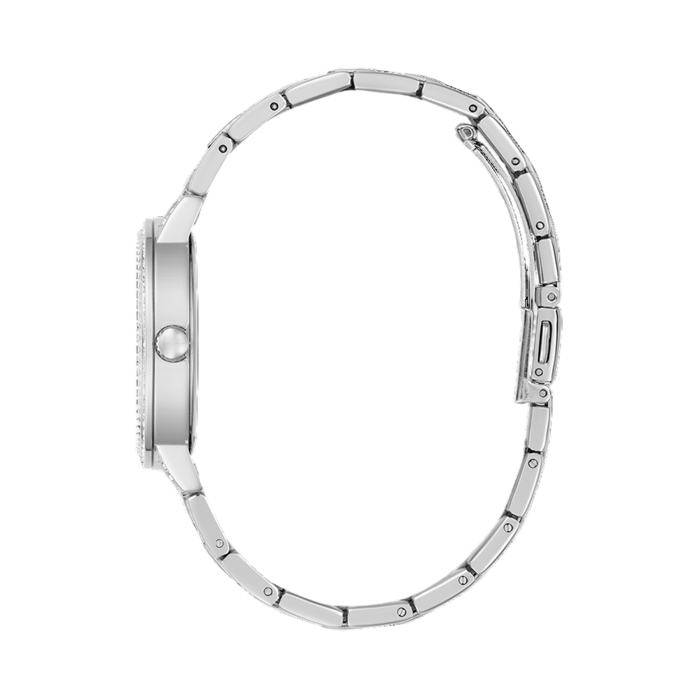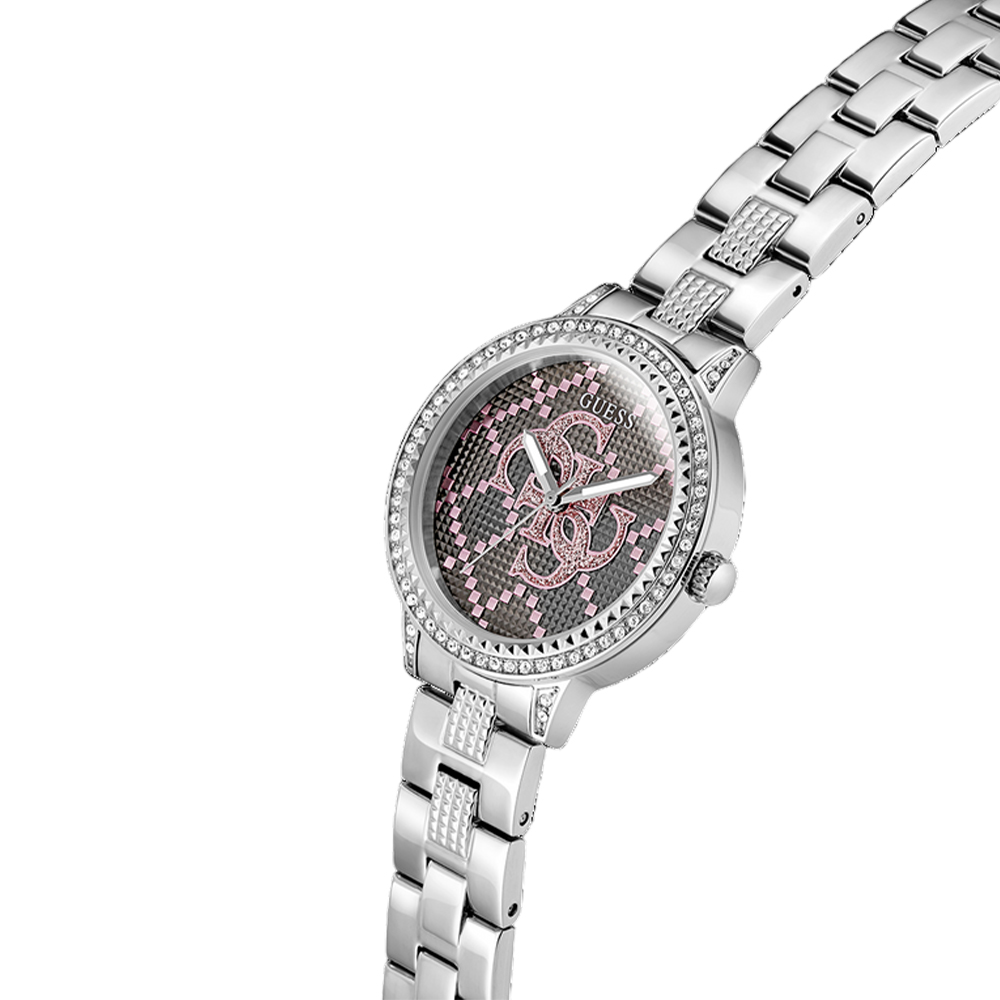 A glamorous and sophisticated analog watch for women from the GUESS G LACE collection, designed to make a statement. The 34mm round case is made from polished recycled steel and features a beautiful crystal-embellished bezel. The silver dial, with its shimmering details, and the matching silver-toned stainless steel bracelet exude modern elegance. With 30-meter water resistance and reliable quartz movement, this watch is a perfect blend of beauty and practicality.