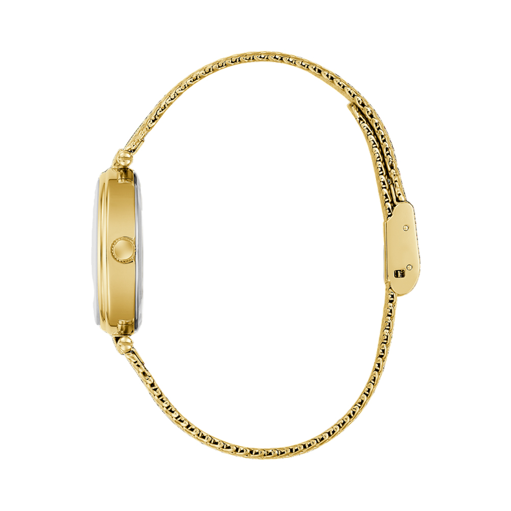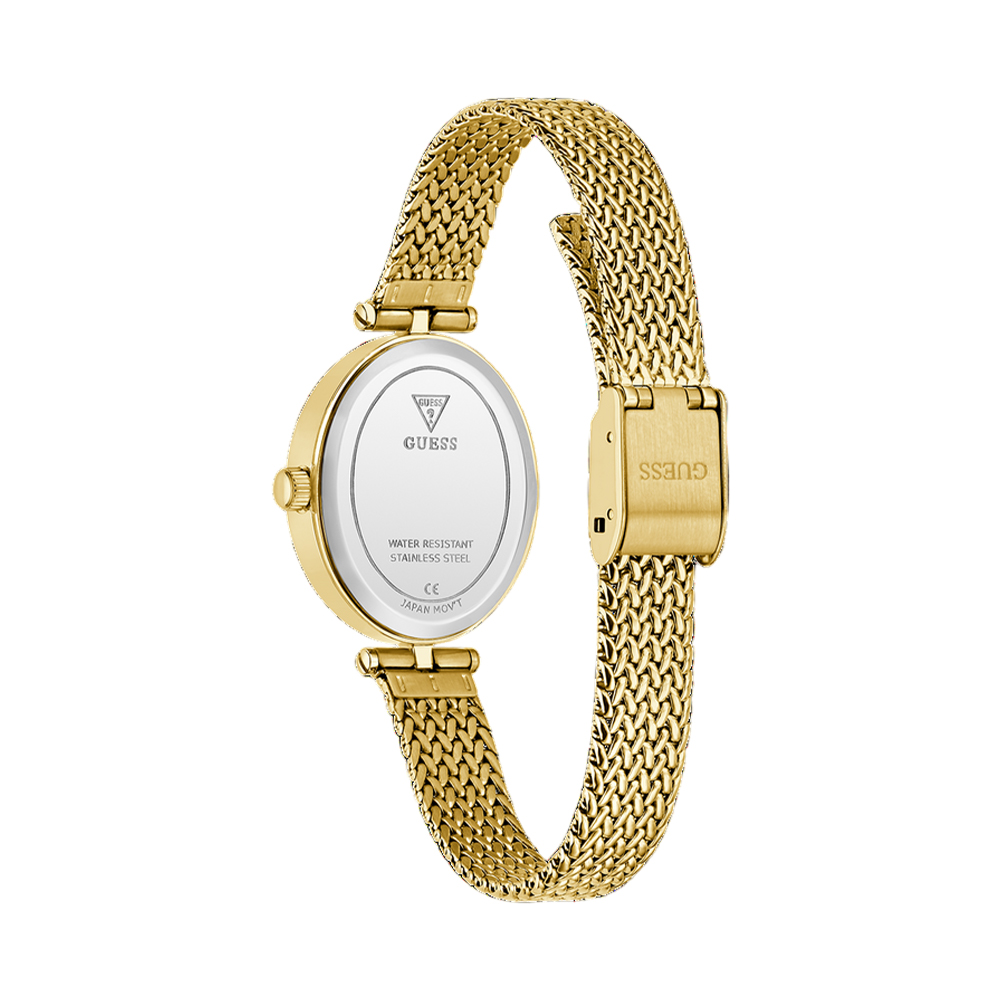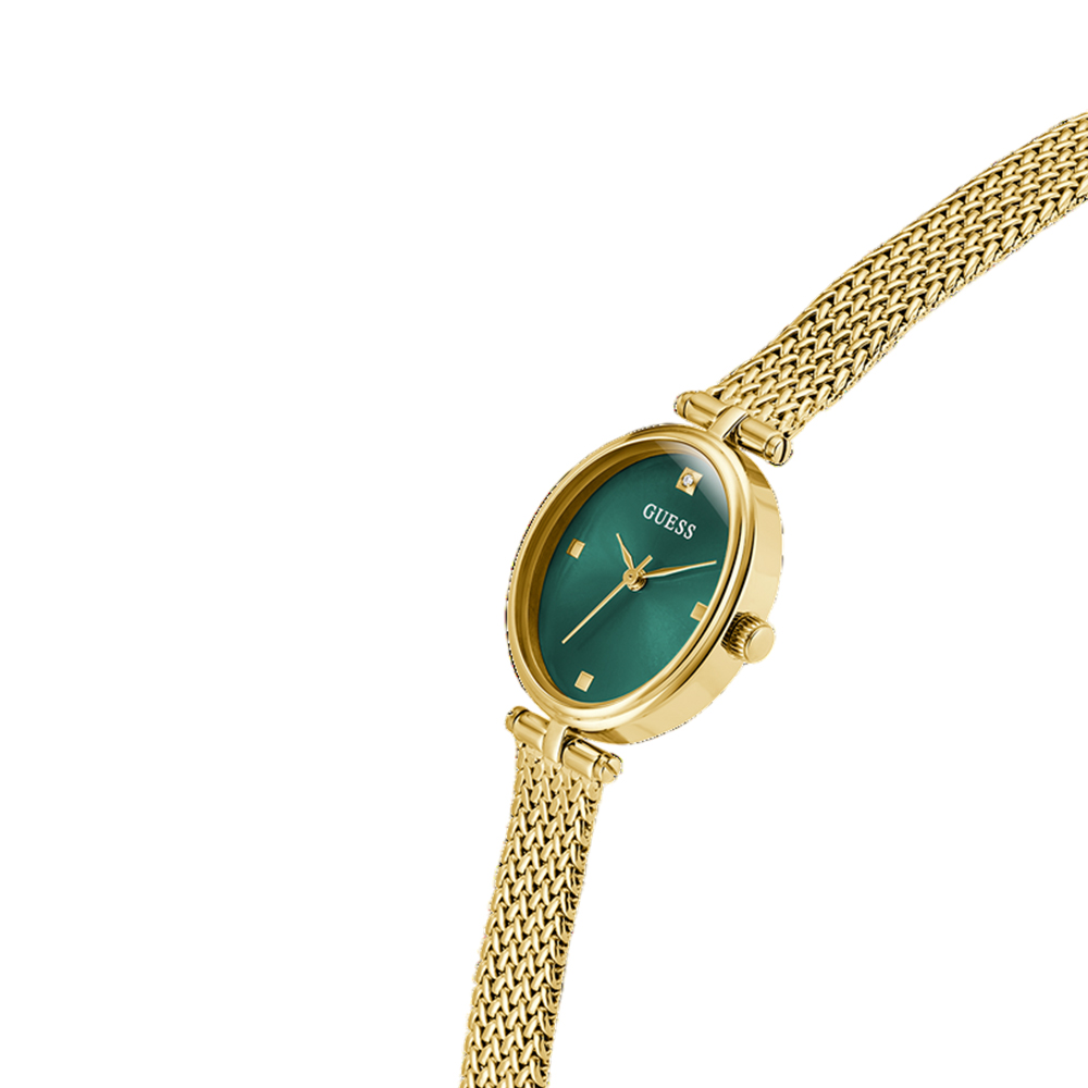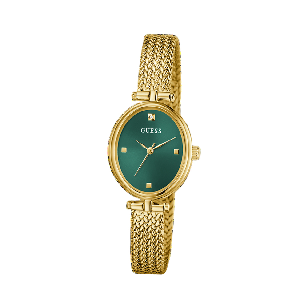 A feminine and sophisticated analog watch for women from GUESS, perfect for adding a touch of elegance to any outfit. This timepiece features a striking oval green dial with a lab-grown diamond at the 12 o'clock position, set within a gold-tone stainless steel case. The herring-bone textured, self-adjustable mesh bracelet in a gold-tone finish provides a comfortable and secure fit. With its water-resistant design and precise quartz movement, this watch offers both beauty and reliable functionality.