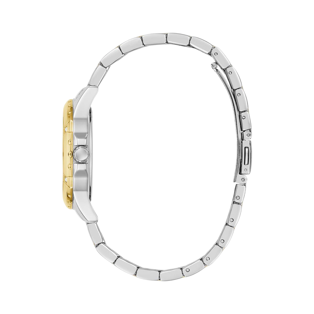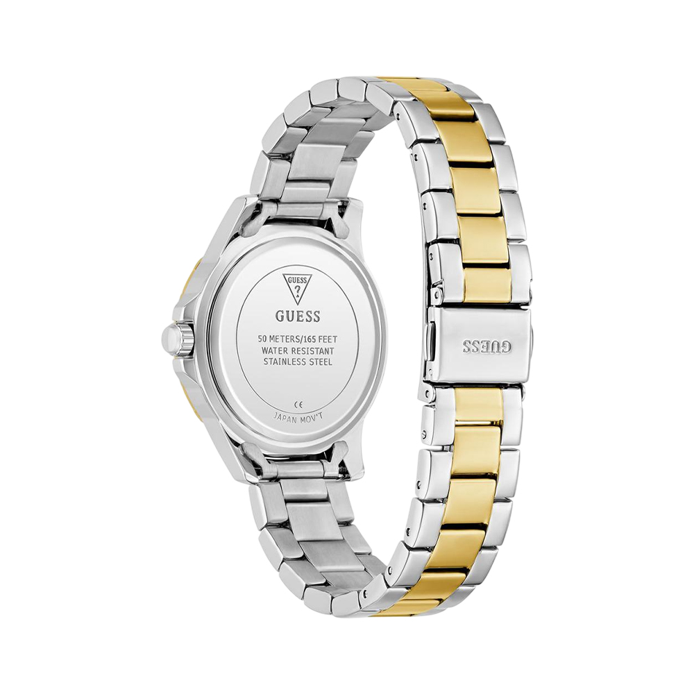 A chic and fashionable women's analog watch from GUESS, featuring a round, blue dial and a stylish two-toned stainless steel strap. With its vibrant color and durable construction, this timepiece offers a perfect blend of sportiness and elegance. It is equipped with quartz movement and is water-resistant, making it a versatile accessory for everyday wear or a unique accent for a statement look.