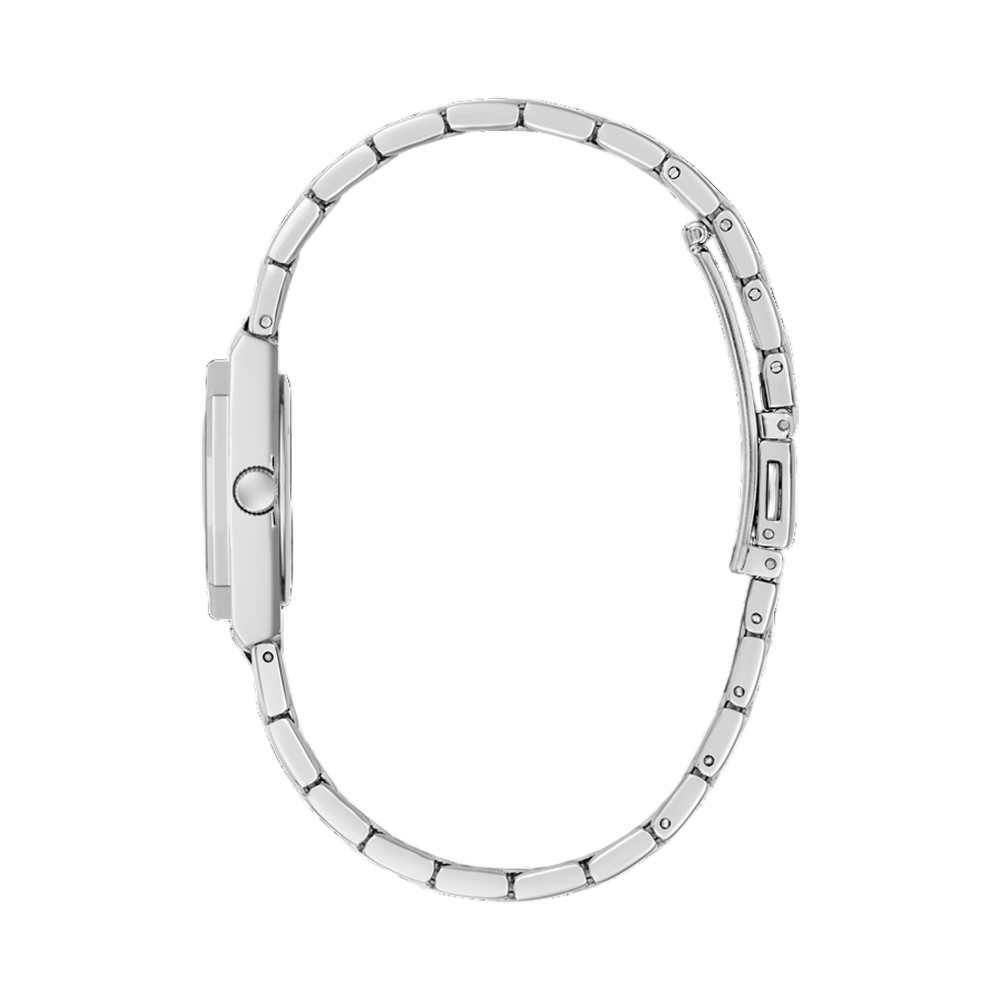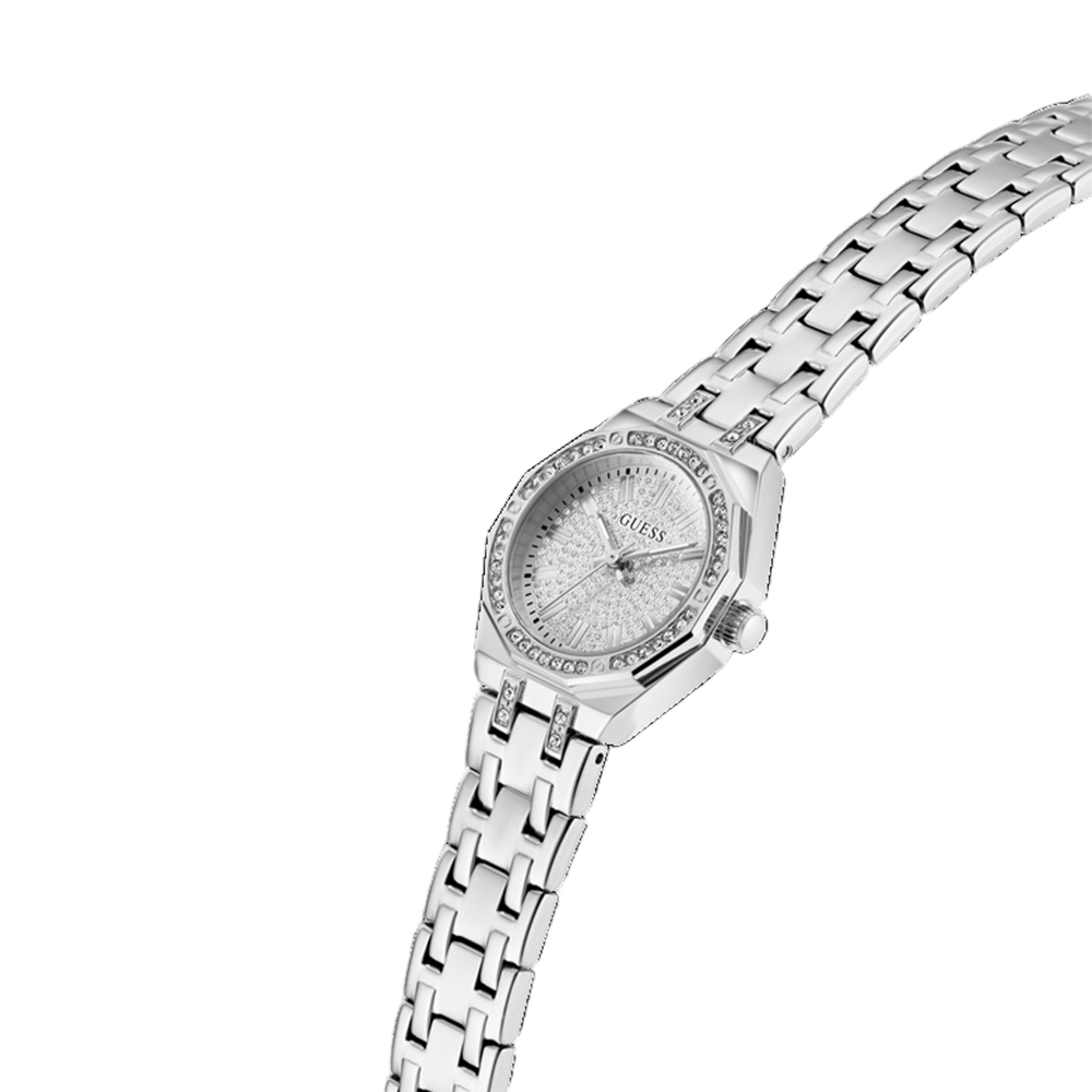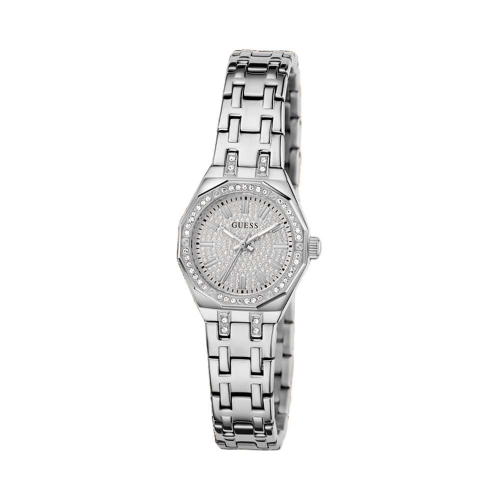 A classy and chic analog timepiece for women from the GUESS collection, designed with a timeless feel and modern details. This watch features a circular, silver-toned case with a stone-studded bezel, adding a touch of glamour. The silver-toned dial with subtle shimmer and luminous hands is both stylish and functional. The stainless steel bracelet-style strap, secured with a fold-over clasp, ensures a secure and comfortable fit. With 30-meter water resistance, this watch is the perfect everyday accessory for the modern woman.