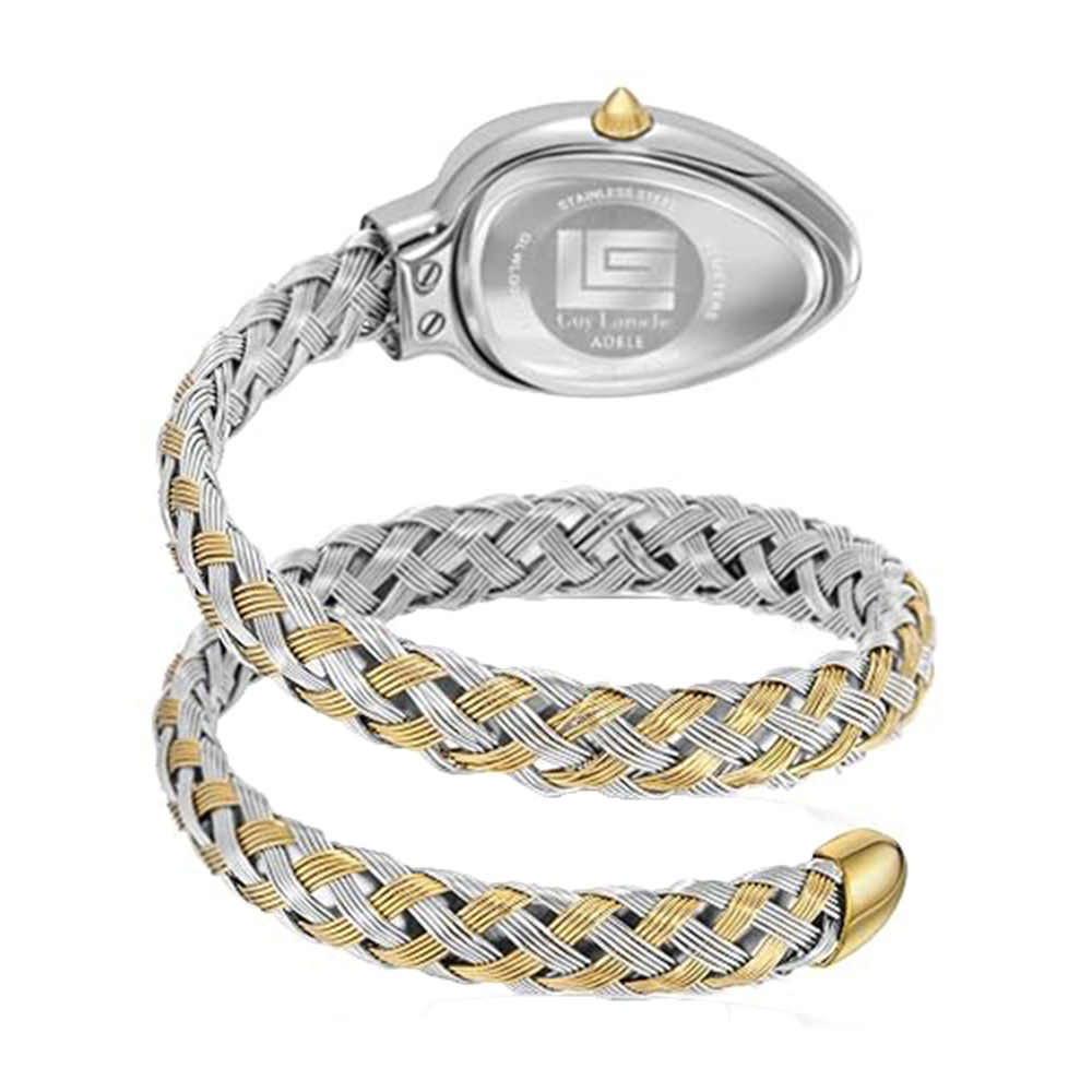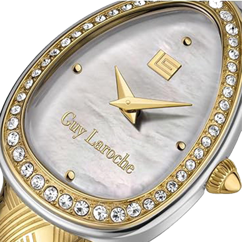 This Guy Laroche Adele watch features a sleek oval case paired with a clean white dial and a polished gold-tone metal bracelet. Powered by a reliable quartz movement, it ensures accurate timekeeping. Designed for women, it includes a secure jewelry clasp and a timeless design, making it perfect for both everyday elegance and special occasions.