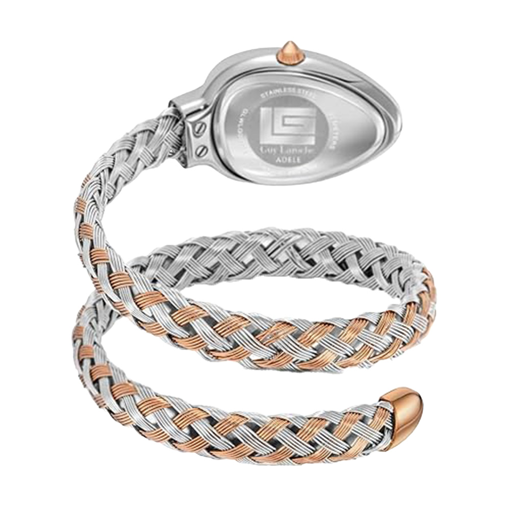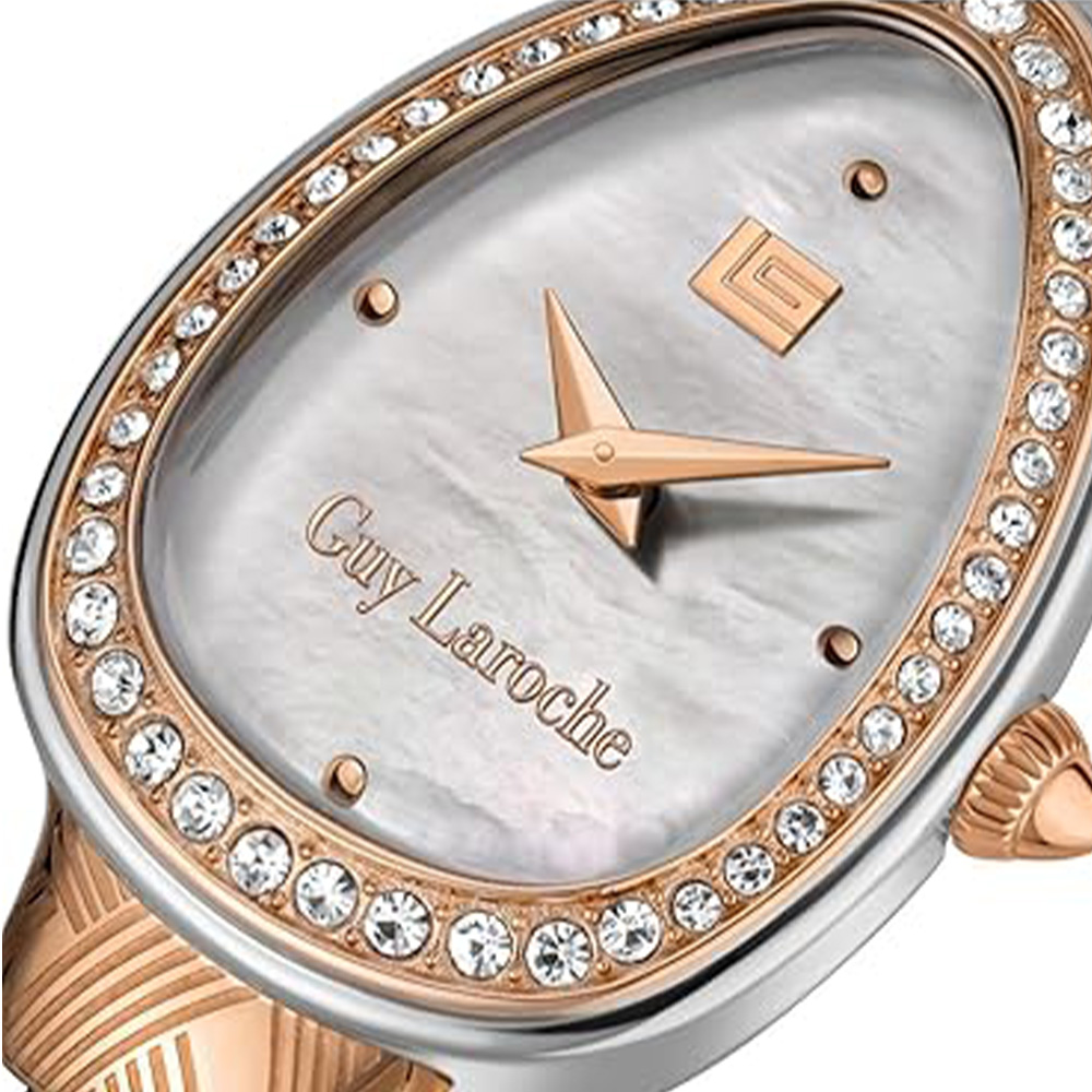 This Guy Laroche Adele watch features a sleek oval case paired with a clean white dial and a polished rose gold-tone metal bracelet. Powered by a reliable quartz movement, it ensures accurate timekeeping. Designed for women, it includes a secure jewelry clasp and a timeless design, making it perfect for both everyday elegance and special occasions.