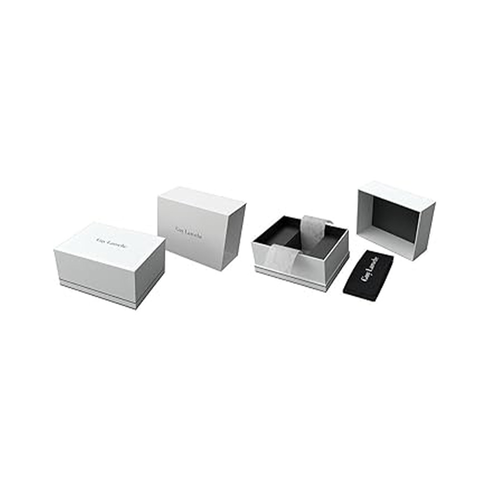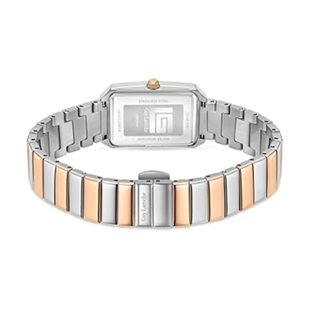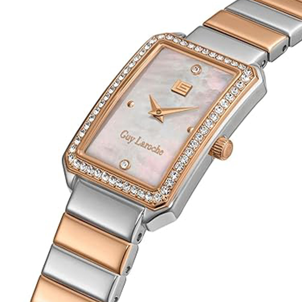 This Guy Laroche Deborah watch features a sleek rectangular case paired with a clean white dial and a polished rose gold-tone metal bracelet. Powered by a reliable quartz movement, it ensures accurate timekeeping. Designed for women, it includes a secure deployment clasp and a timeless design, making it ideal for both everyday elegance and special occasions.