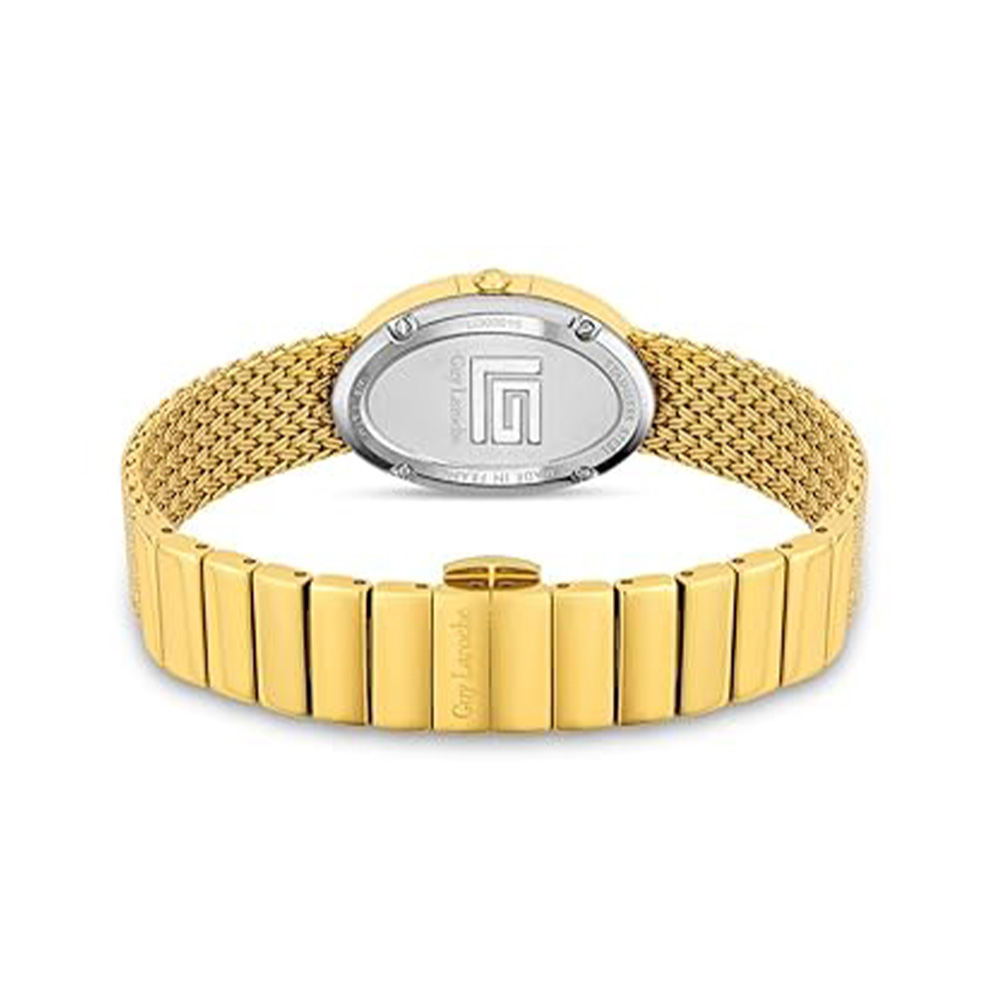 This Guy Laroche Emma watch features a sleek oval case paired with a rich green dial and a polished gold-tone metal bracelet. Powered by a reliable quartz movement, it ensures precise timekeeping. Designed for women, it includes a secure deployment clasp and a stylish design, making it ideal for both everyday wear and special occasions.