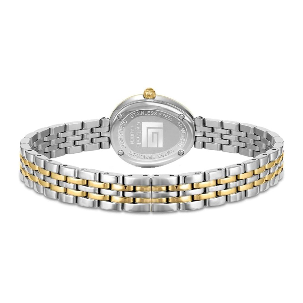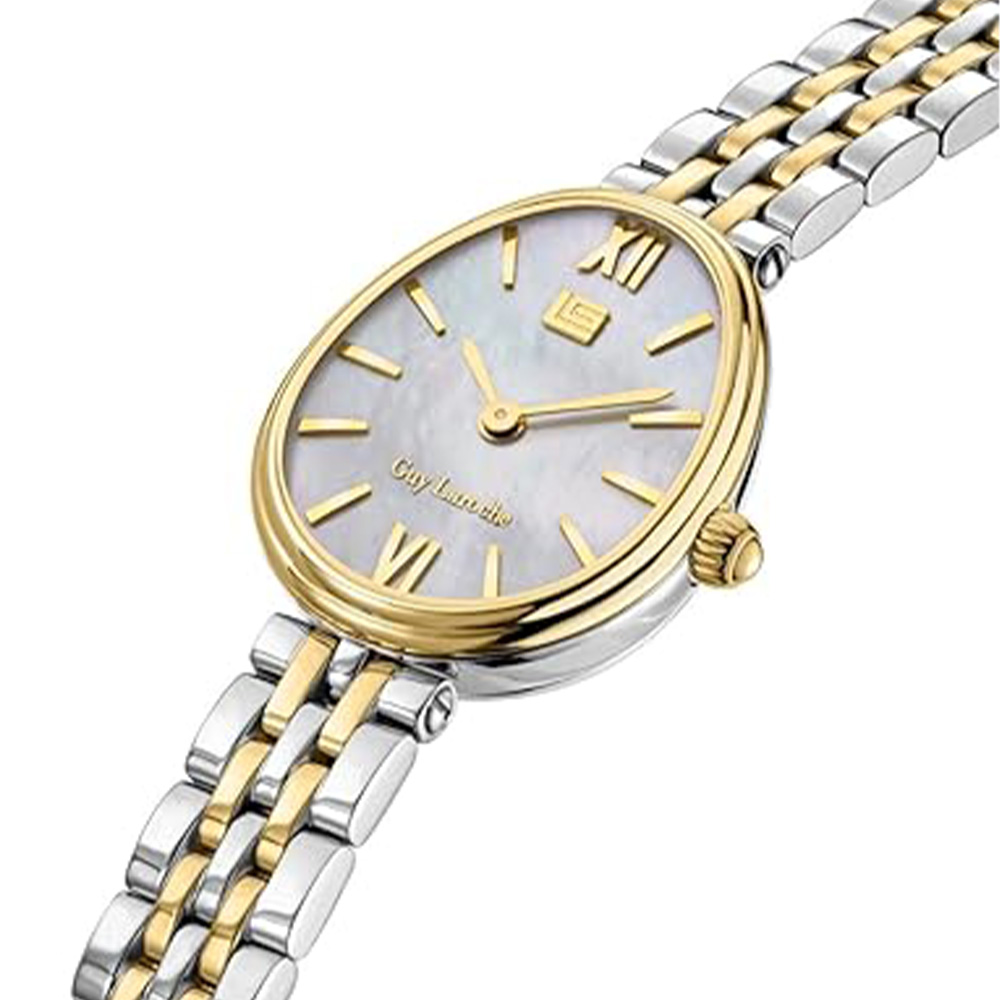 This Guy Laroche Lauren watch features a sleek stainless steel case with a white mother-of-pearl dial and Roman numeral indices, complemented by a two-tone silver and yellow gold bracelet. Powered by a reliable quartz movement, it ensures accurate timekeeping. Designed for women, it includes a secure foldover clasp and a classic aesthetic, making it ideal for both everyday elegance and formal occasions.