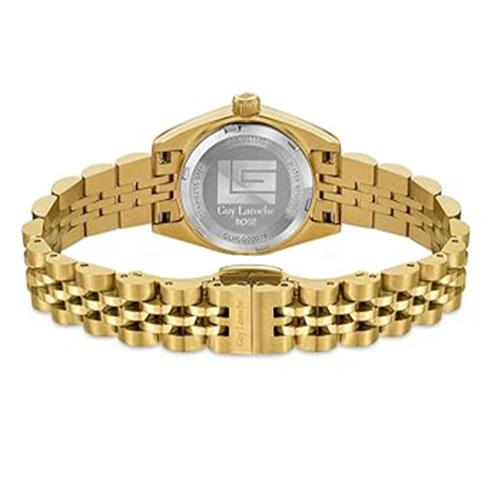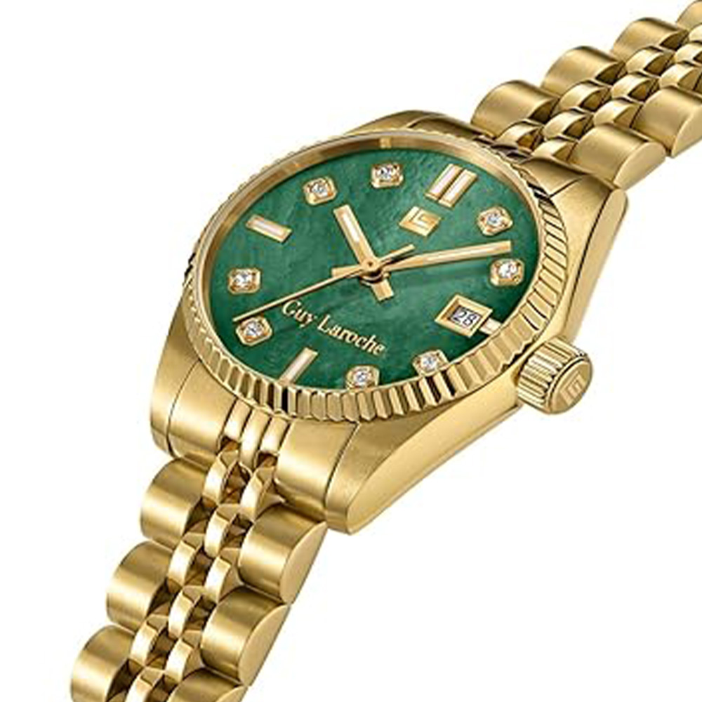 This Guy Laroche Rose watch features a polished round case paired with a rich green dial and a sleek gold-tone metal bracelet. Powered by a reliable quartz movement, it ensures precise timekeeping. Designed for women, it includes a secure deployment clasp and a versatile design, making it ideal for both everyday wear and special occasions.