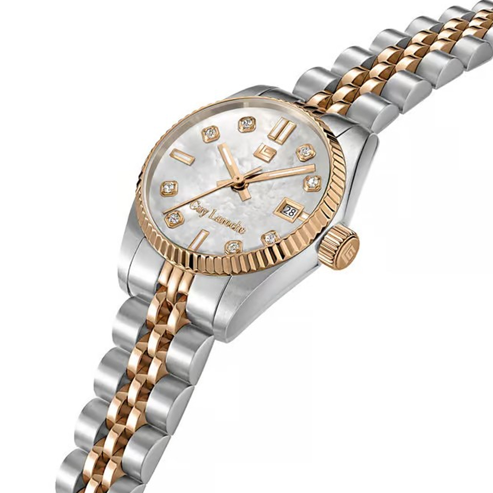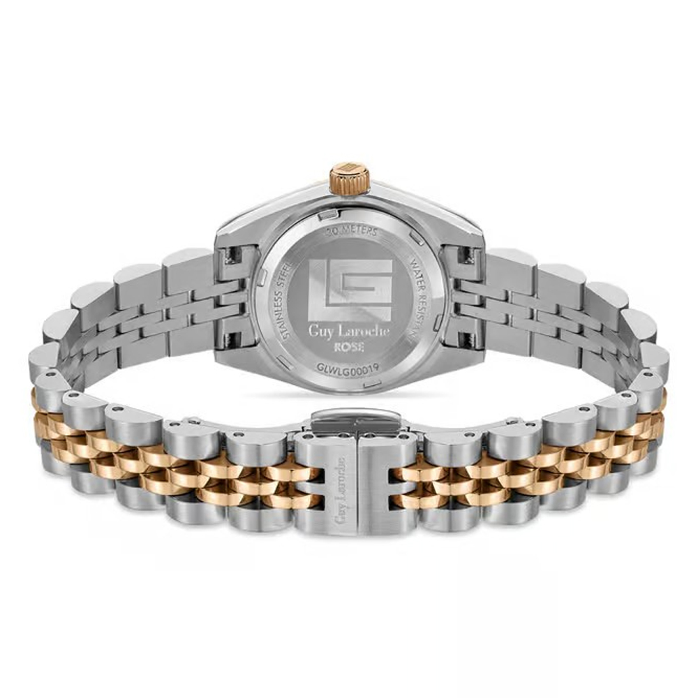 This Guy Laroche Rose watch features a polished stainless steel case paired with a white mother-of-pearl dial and date display. The two-tone stainless steel bracelet enhances its sophisticated appeal, while the mineral glass ensures durability. Powered by a reliable quartz movement, it is ideal for both everyday elegance and special occasions.