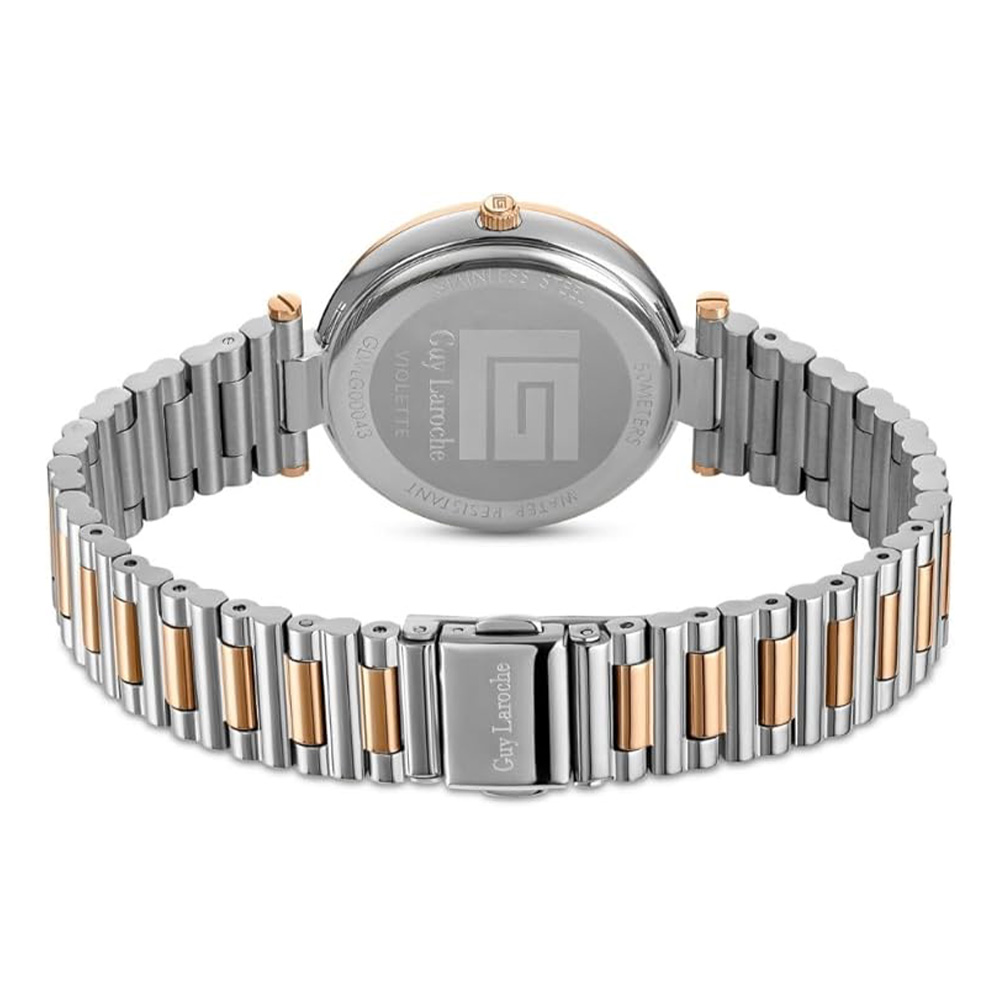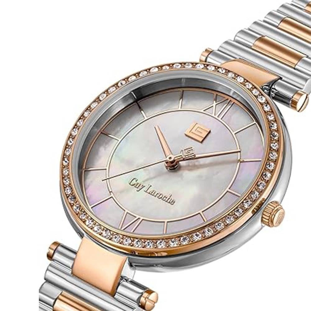 This Guy Laroche Violette watch features a polished stainless steel case with a white mother-of-pearl dial and Roman numeral indices, complemented by a two-tone silver and rose gold bracelet. The crystal-embellished bezel enhances its sophisticated appeal, while the quartz movement ensures precise timekeeping. Designed for women, it includes a secure foldover clasp, making it ideal for both everyday wear and formal occasions.