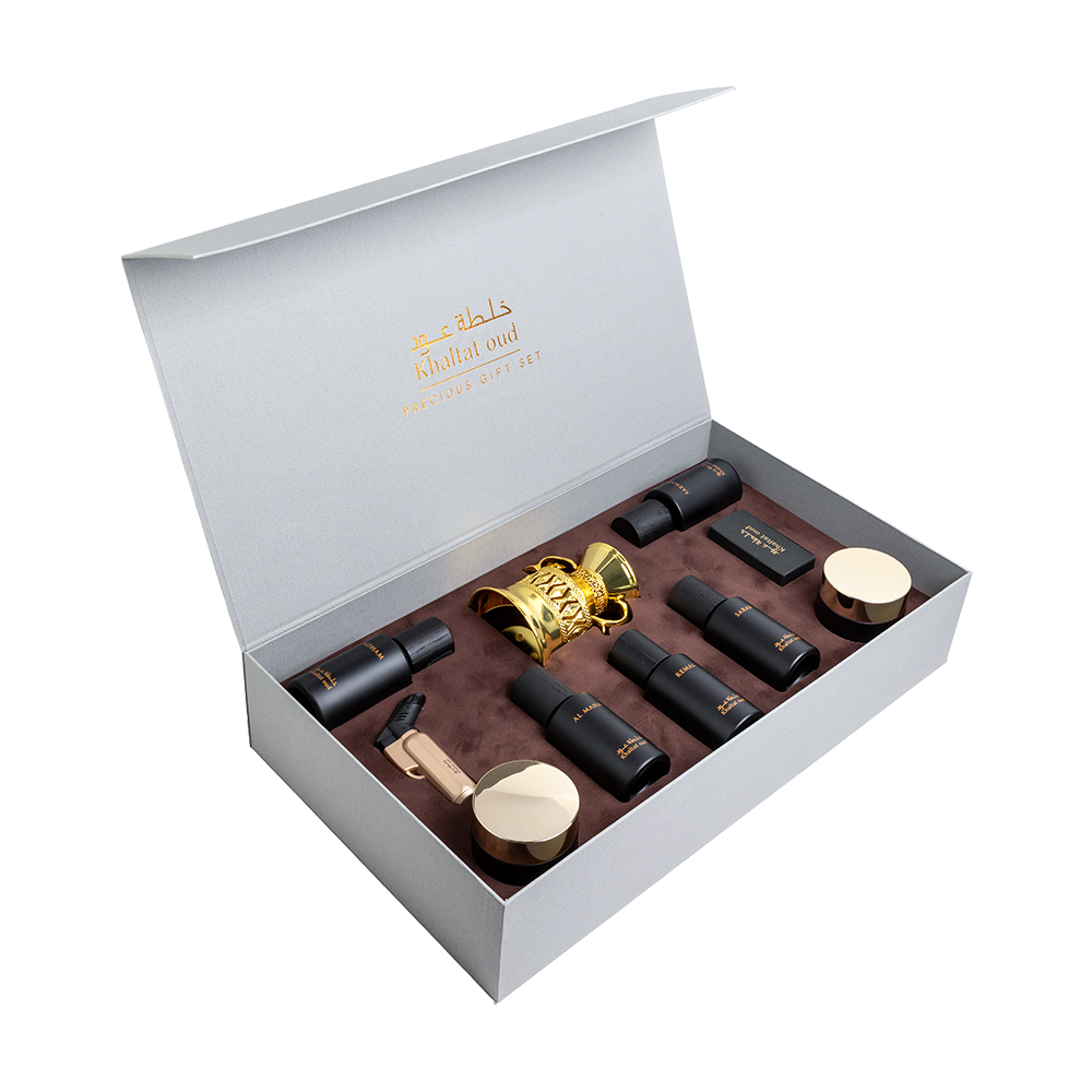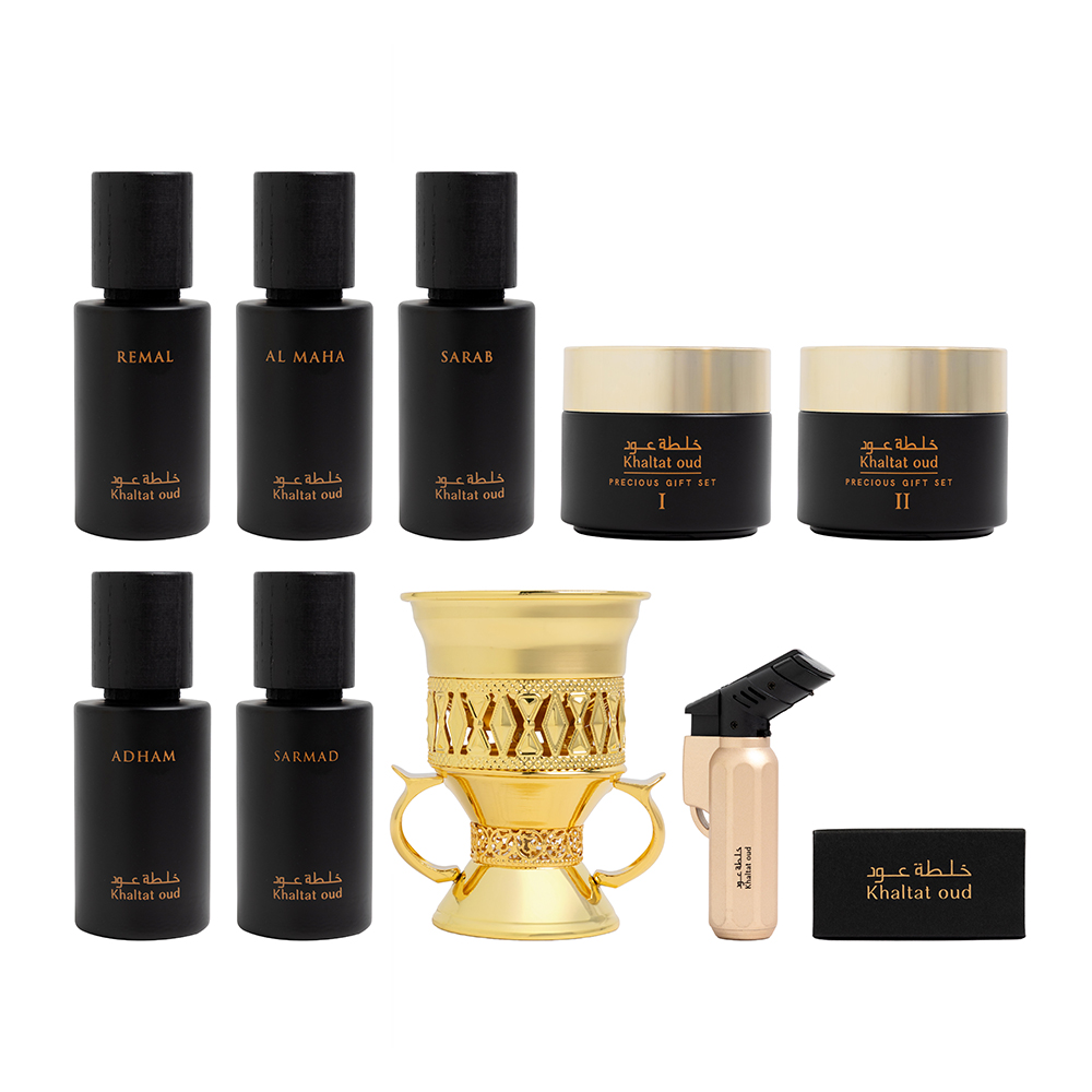 The gift set includes Adham Perfume, Remal Perfume, Sarmad Perfume, Khaltat Oud I, Khaltat Oud II, Sarab Perfume, and Al Maha Perfume. Each fragrance is carefully crafted using the finest ingredients, resulting in unique and captivating scents that will leave a lasting impression.